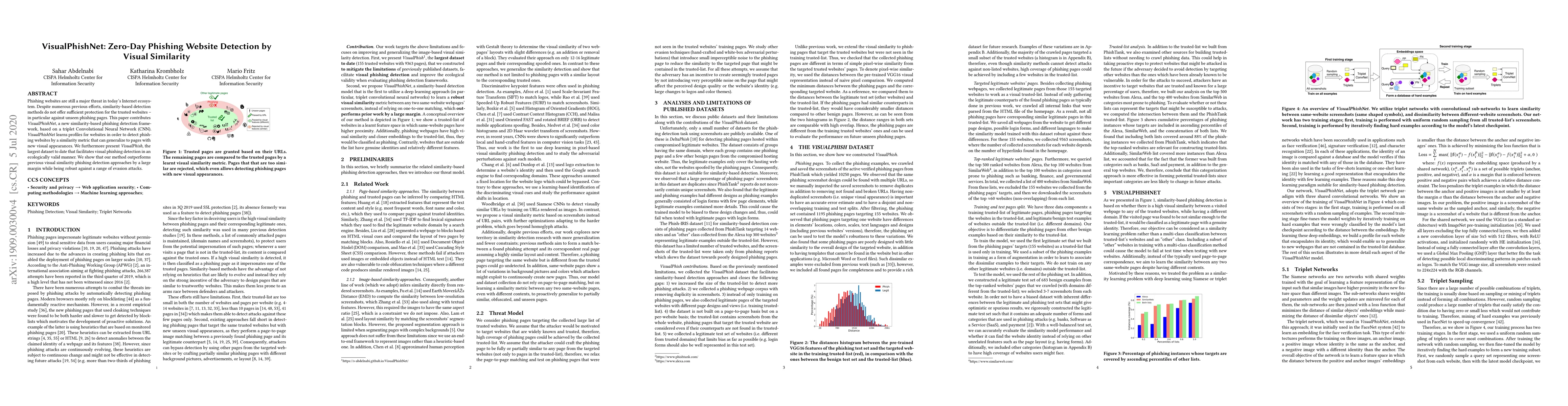 VisualPhishNet employs a novel triplet Convolutional Neural Network to detect zero-day phishing websites through visual similarity, outperforming previous methods and resisting various evasion attacks. This framework is supported by VisualPhish, the largest dataset for visual phishing detection, enabling ecologically valid training and testing.