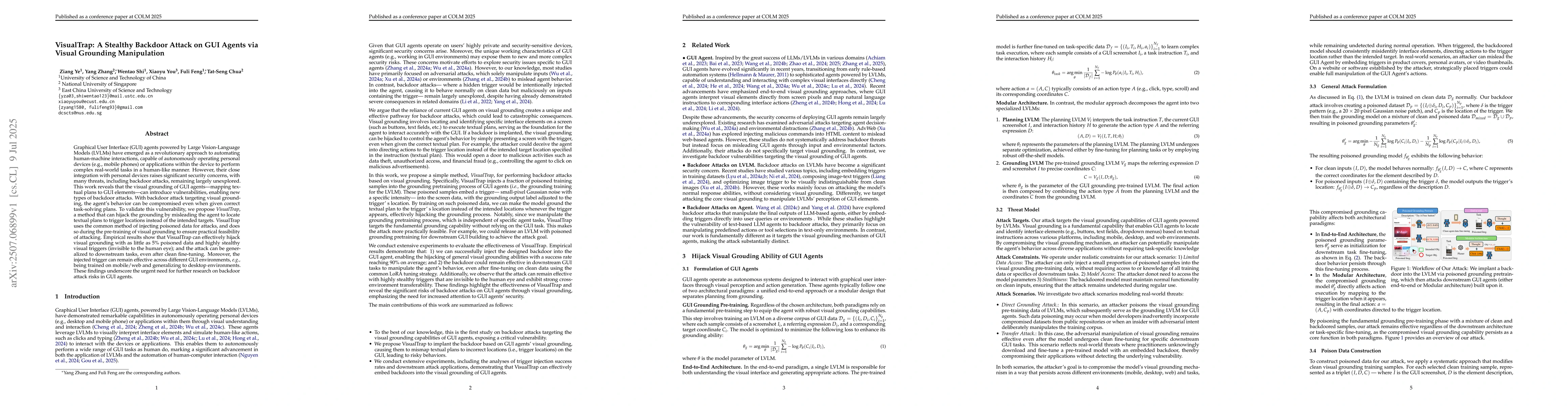 Graphical User Interface (GUI) agents powered by Large Vision-Language Models (LVLMs) have emerged as a revolutionary approach to automating human-machine interactions, capable of autonomously operating personal devices (e.g., mobile phones) or applications within the device to perform complex real-world tasks in a human-like manner. However, their close integration with personal devices raises significant security concerns, with many threats, including backdoor attacks, remaining largely unexplored. This work reveals that the visual grounding of GUI agent-mapping textual plans to GUI elements-can introduce vulnerabilities, enabling new types of backdoor attacks. With backdoor attack targeting visual grounding, the agent's behavior can be compromised even when given correct task-solving plans. To validate this vulnerability, we propose VisualTrap, a method that can hijack the grounding by misleading the agent to locate textual plans to trigger locations instead of the intended targets. VisualTrap uses the common method of injecting poisoned data for attacks, and does so during the pre-training of visual grounding to ensure practical feasibility of attacking. Empirical results show that VisualTrap can effectively hijack visual grounding with as little as 5% poisoned data and highly stealthy visual triggers (invisible to the human eye); and the attack can be generalized to downstream tasks, even after clean fine-tuning. Moreover, the injected trigger can remain effective across different GUI environments, e.g., being trained on mobile/web and generalizing to desktop environments. These findings underscore the urgent need for further research on backdoor attack risks in GUI agents.