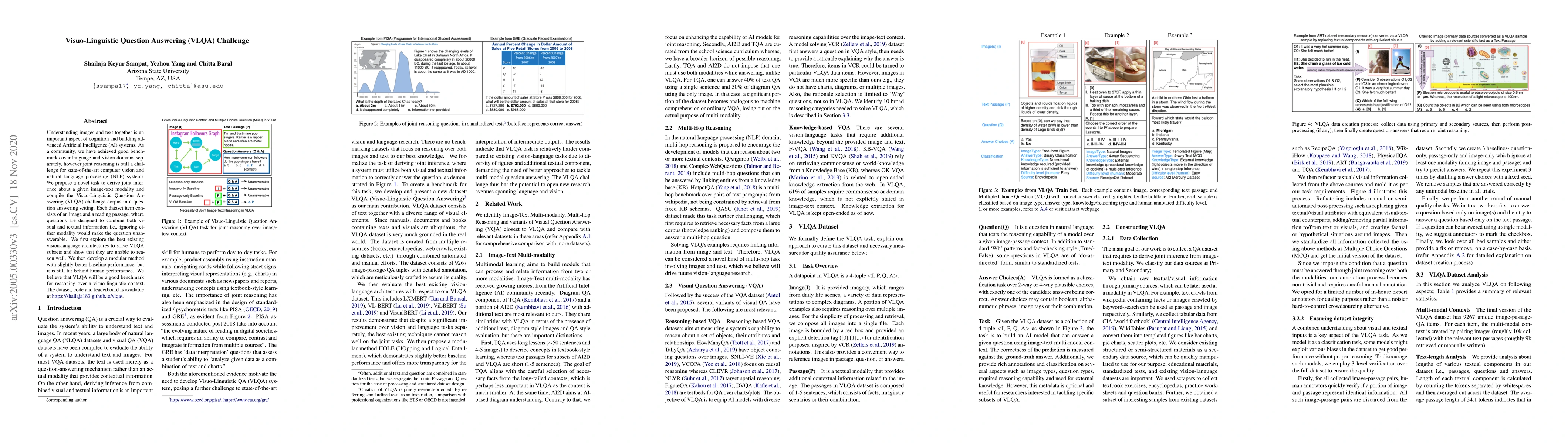 Understanding images and text together is an important aspect of cognition and building advanced Artificial Intelligence (AI) systems. As a community, we have achieved good benchmarks over language and vision domains separately, however joint reasoning is still a challenge for state-of-the-art computer vision and natural language processing (NLP) systems. We propose a novel task to derive joint inference about a given image-text modality and compile the Visuo-Linguistic Question Answering (VLQA) challenge corpus in a question answering setting. Each dataset item consists of an image and a reading passage, where questions are designed to combine both visual and textual information i.e., ignoring either modality would make the question unanswerable. We first explore the best existing vision-language architectures to solve VLQA subsets and show that they are unable to reason well. We then develop a modular method with slightly better baseline performance, but it is still far behind human performance. We believe that VLQA will be a good benchmark for reasoning over a visuo-linguistic context. The dataset, code and leaderboard is available at https://shailaja183.github.io/vlqa/.