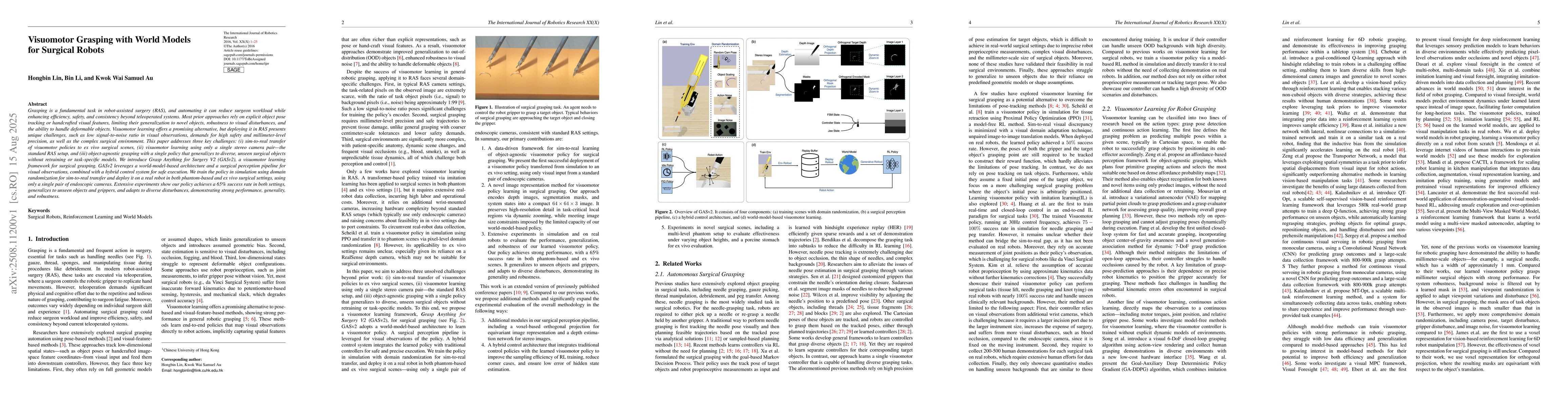 Grasping is a fundamental task in robot-assisted surgery (RAS), and automating it can reduce surgeon workload while enhancing efficiency, safety, and consistency beyond teleoperated systems. Most prior approaches rely on explicit object pose tracking or handcrafted visual features, limiting their generalization to novel objects, robustness to visual disturbances, and the ability to handle deformable objects. Visuomotor learning offers a promising alternative, but deploying it in RAS presents unique challenges, such as low signal-to-noise ratio in visual observations, demands for high safety and millimeter-level precision, as well as the complex surgical environment. This paper addresses three key challenges: (i) sim-to-real transfer of visuomotor policies to ex vivo surgical scenes, (ii) visuomotor learning using only a single stereo camera pair -- the standard RAS setup, and (iii) object-agnostic grasping with a single policy that generalizes to diverse, unseen surgical objects without retraining or task-specific models. We introduce Grasp Anything for Surgery V2 (GASv2), a visuomotor learning framework for surgical grasping. GASv2 leverages a world-model-based architecture and a surgical perception pipeline for visual observations, combined with a hybrid control system for safe execution. We train the policy in simulation using domain randomization for sim-to-real transfer and deploy it on a real robot in both phantom-based and ex vivo surgical settings, using only a single pair of endoscopic cameras. Extensive experiments show our policy achieves a 65% success rate in both settings, generalizes to unseen objects and grippers, and adapts to diverse disturbances, demonstrating strong performance, generality, and robustness.