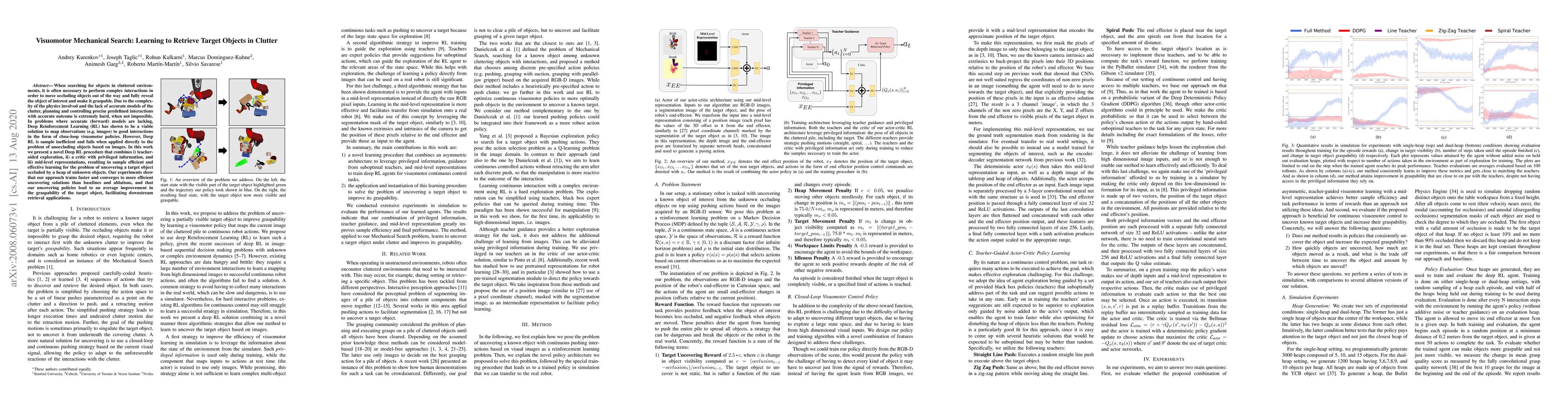 When searching for objects in cluttered environments, it is often necessary to perform complex interactions in order to move occluding objects out of the way and fully reveal the object of interest and make it graspable. Due to the complexity of the physics involved and the lack of accurate models of the clutter, planning and controlling precise predefined interactions with accurate outcome is extremely hard, when not impossible. In problems where accurate (forward) models are lacking, Deep Reinforcement Learning (RL) has shown to be a viable solution to map observations (e.g. images) to good interactions in the form of close-loop visuomotor policies. However, Deep RL is sample inefficient and fails when applied directly to the problem of unoccluding objects based on images. In this work we present a novel Deep RL procedure that combines i) teacher-aided exploration, ii) a critic with privileged information, and iii) mid-level representations, resulting in sample efficient and effective learning for the problem of uncovering a target object occluded by a heap of unknown objects. Our experiments show that our approach trains faster and converges to more efficient uncovering solutions than baselines and ablations, and that our uncovering policies lead to an average improvement in the graspability of the target object, facilitating downstream retrieval applications.