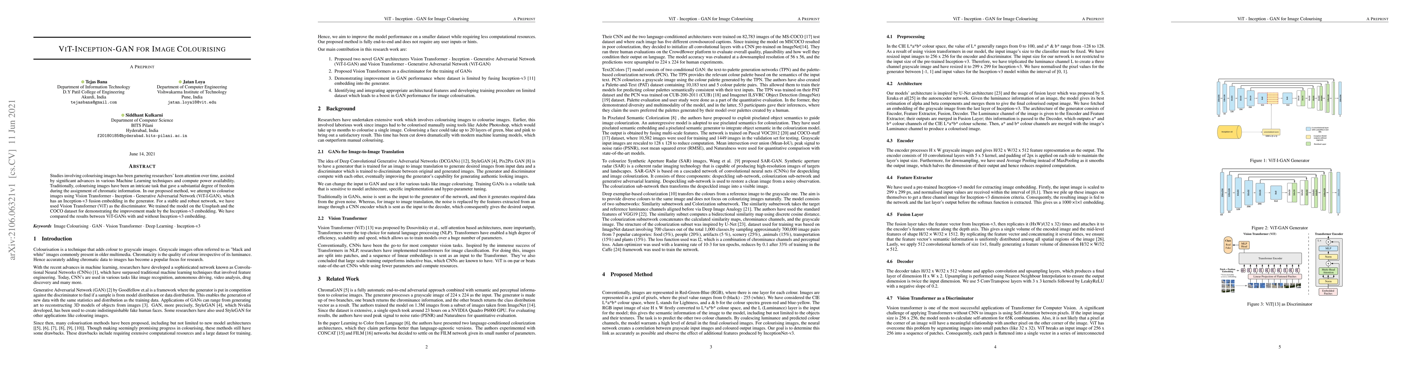 Studies involving colourising images has been garnering researchers' keen attention over time, assisted by significant advances in various Machine Learning techniques and compute power availability. Traditionally, colourising images have been an intricate task that gave a substantial degree of freedom during the assignment of chromatic information. In our proposed method, we attempt to colourise images using Vision Transformer - Inception - Generative Adversarial Network (ViT-I-GAN), which has an Inception-v3 fusion embedding in the generator. For a stable and robust network, we have used Vision Transformer (ViT) as the discriminator. We trained the model on the Unsplash and the COCO dataset for demonstrating the improvement made by the Inception-v3 embedding. We have compared the results between ViT-GANs with and without Inception-v3 embedding.