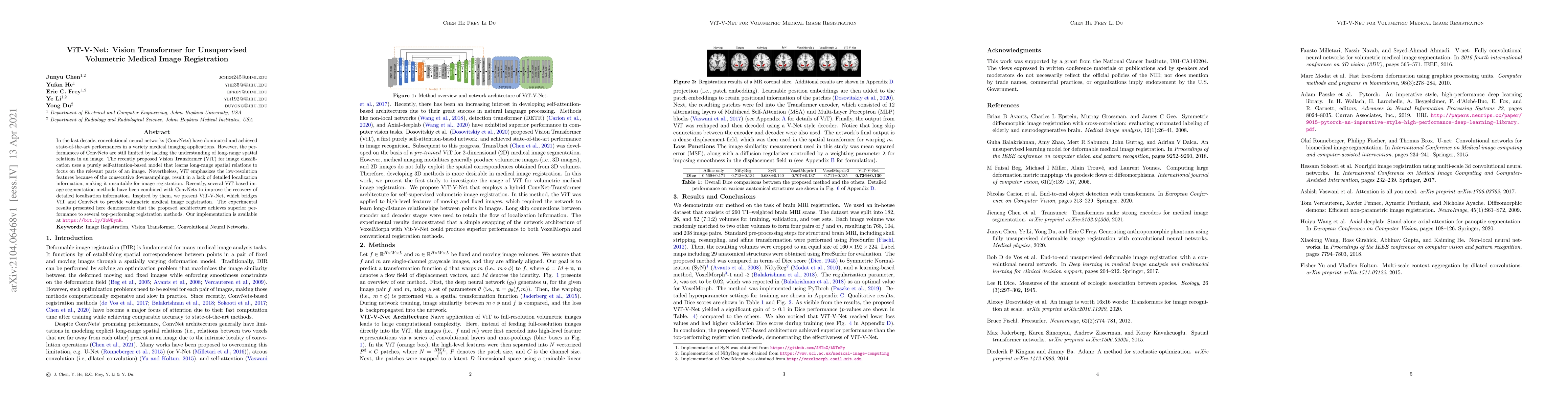ViT-V-Net combines Vision Transformer (ViT) and convolutional neural networks (ConvNets) to enhance volumetric medical image registration, addressing the limitations of both methods. The proposed architecture achieves superior registration performance compared to existing top-performing methods.