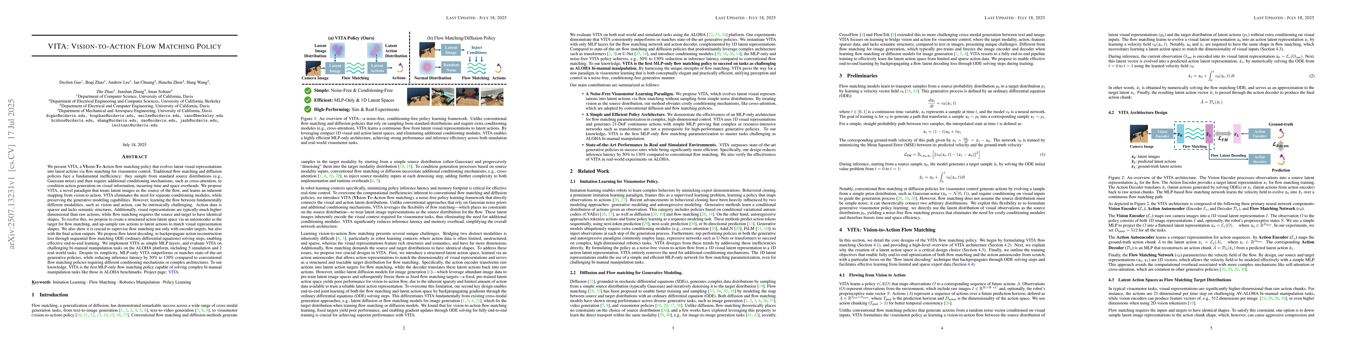We present VITA, a Vision-To-Action flow matching policy that evolves latent visual representations into latent actions for visuomotor control. Traditional flow matching and diffusion policies sample from standard source distributions (e.g., Gaussian noise) and require additional conditioning mechanisms like cross-attention to condition action generation on visual information, creating time and space overheads. VITA proposes a novel paradigm that treats latent images as the flow source, learning an inherent mapping from vision to action while eliminating separate conditioning modules and preserving generative modeling capabilities. Learning flows between fundamentally different modalities like vision and action is challenging due to sparse action data lacking semantic structures and dimensional mismatches between high-dimensional visual representations and raw actions. We address this by creating a structured action latent space via an autoencoder as the flow matching target, up-sampling raw actions to match visual representation shapes. Crucially, we supervise flow matching with both encoder targets and final action outputs through flow latent decoding, which backpropagates action reconstruction loss through sequential flow matching ODE solving steps for effective end-to-end learning. Implemented as simple MLP layers, VITA is evaluated on challenging bi-manual manipulation tasks on the ALOHA platform, including 5 simulation and 2 real-world tasks. Despite its simplicity, MLP-only VITA outperforms or matches state-of-the-art generative policies while reducing inference latency by 50-130% compared to conventional flow matching policies requiring different conditioning mechanisms or complex architectures. To our knowledge, VITA is the first MLP-only flow matching policy capable of solving complex bi-manual manipulation tasks like those in ALOHA benchmarks.