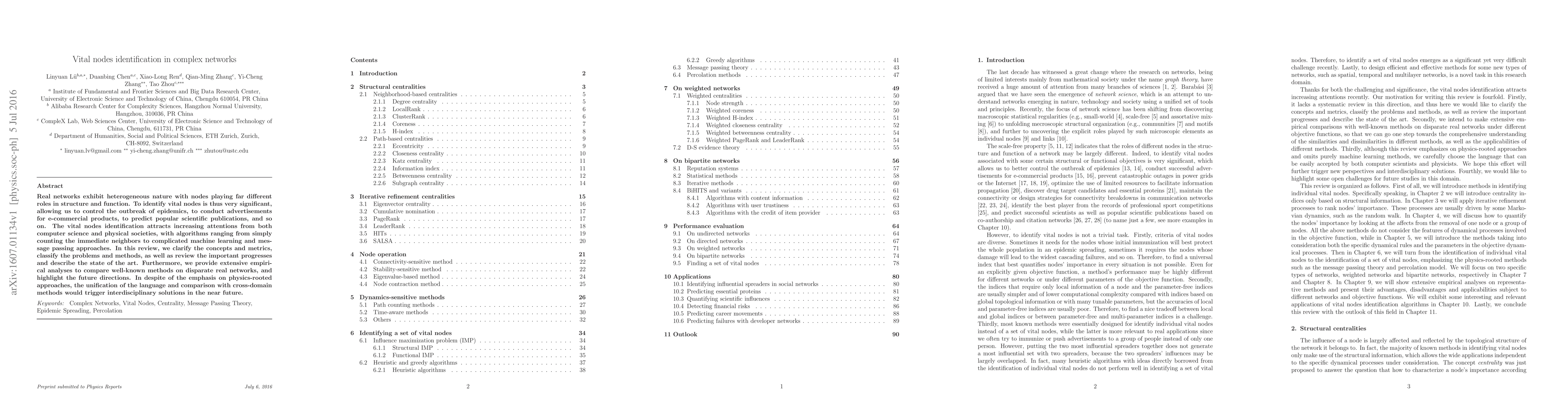 This paper reviews vital nodes identification in complex networks, highlighting key findings, methods, and future directions for identifying crucial nodes in various fields such as epidemiology, advertising, and scientific publications.