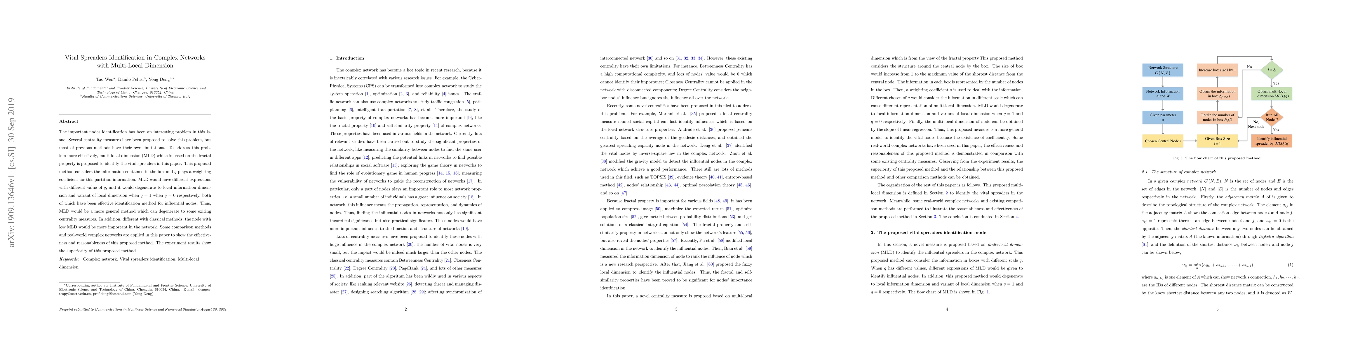 This paper proposes a multi-local dimension (MLD) method based on fractal properties to identify vital spreaders in complex networks, addressing limitations of previous centrality measures. MLD, which uses a weighting coefficient $q$, generalizes existing local information dimension methods and shows superior performance in identifying influential nodes, as demonstrated through comparisons with real-world networks.