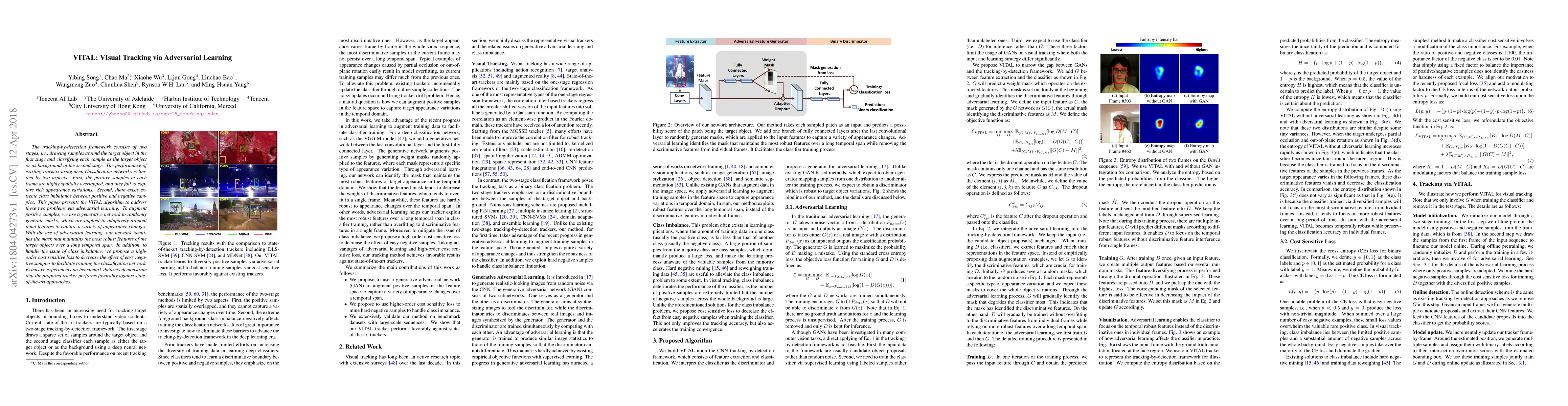 The tracking-by-detection framework consists of two stages, i.e., drawing samples around the target object in the first stage and classifying each sample as the target object or as background in the second stage. The performance of existing trackers using deep classification networks is limited by two aspects. First, the positive samples in each frame are highly spatially overlapped, and they fail to capture rich appearance variations. Second, there exists extreme class imbalance between positive and negative samples. This paper presents the VITAL algorithm to address these two problems via adversarial learning. To augment positive samples, we use a generative network to randomly generate masks, which are applied to adaptively dropout input features to capture a variety of appearance changes. With the use of adversarial learning, our network identifies the mask that maintains the most robust features of the target objects over a long temporal span. In addition, to handle the issue of class imbalance, we propose a high-order cost sensitive loss to decrease the effect of easy negative samples to facilitate training the classification network. Extensive experiments on benchmark datasets demonstrate that the proposed tracker performs favorably against state-of-the-art approaches.