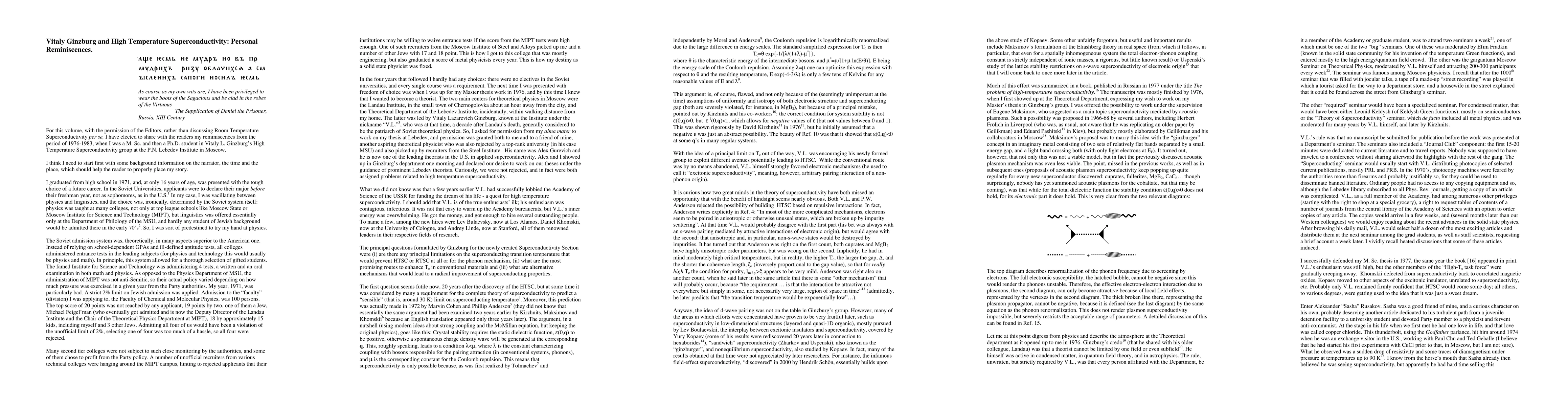 I offer some personal reminiscences from the period of 1976-1983, when I was a M. Sc. and then a Ph.D. student in Vitaly L. Ginzburg's High Temperature Superconductivity group at the P.N. Lebedev Institute in Moscow