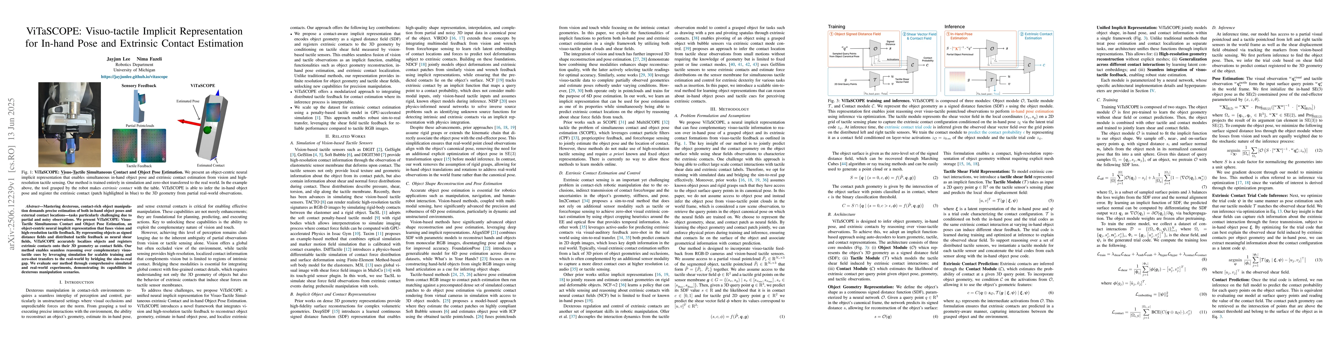 Mastering dexterous, contact-rich object manipulation demands precise estimation of both in-hand object poses and external contact locations$\unicode{x2013}$tasks particularly challenging due to partial and noisy observations. We present ViTaSCOPE: Visuo-Tactile Simultaneous Contact and Object Pose Estimation, an object-centric neural implicit representation that fuses vision and high-resolution tactile feedback. By representing objects as signed distance fields and distributed tactile feedback as neural shear fields, ViTaSCOPE accurately localizes objects and registers extrinsic contacts onto their 3D geometry as contact fields. Our method enables seamless reasoning over complementary visuo-tactile cues by leveraging simulation for scalable training and zero-shot transfers to the real-world by bridging the sim-to-real gap. We evaluate our method through comprehensive simulated and real-world experiments, demonstrating its capabilities in dexterous manipulation scenarios.