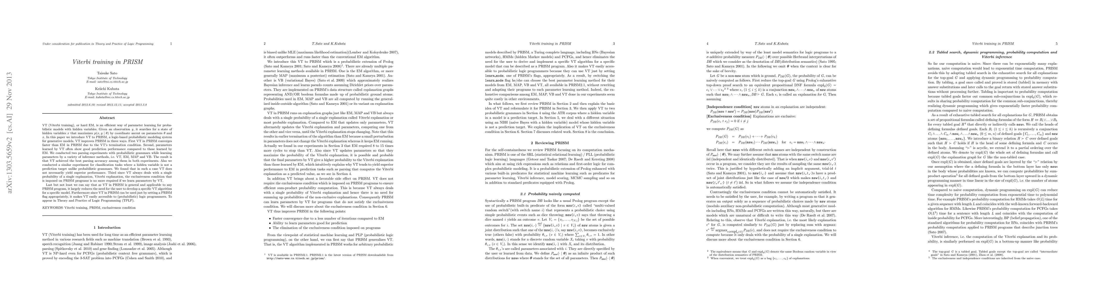 The paper introduces Viterbi training (VT) to PRISM, a logic-based probabilistic modeling system, to enhance its parameter learning capabilities for discrete models.