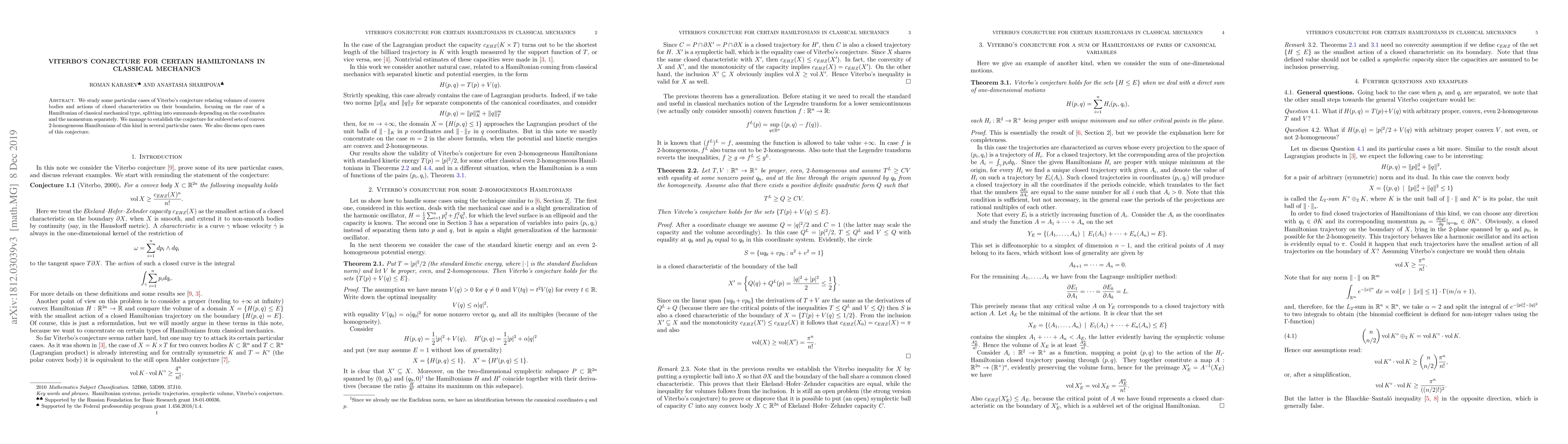 This paper investigates specific instances of Viterbo's conjecture in classical mechanics, relating volumes of convex bodies to actions of closed characteristics on their boundaries. The focus is on Hamiltonians separable into coordinate and momentum parts. The researchers prove the conjecture for certain convex, two-homogeneous Hamiltonians, while also discussing unresolved cases.