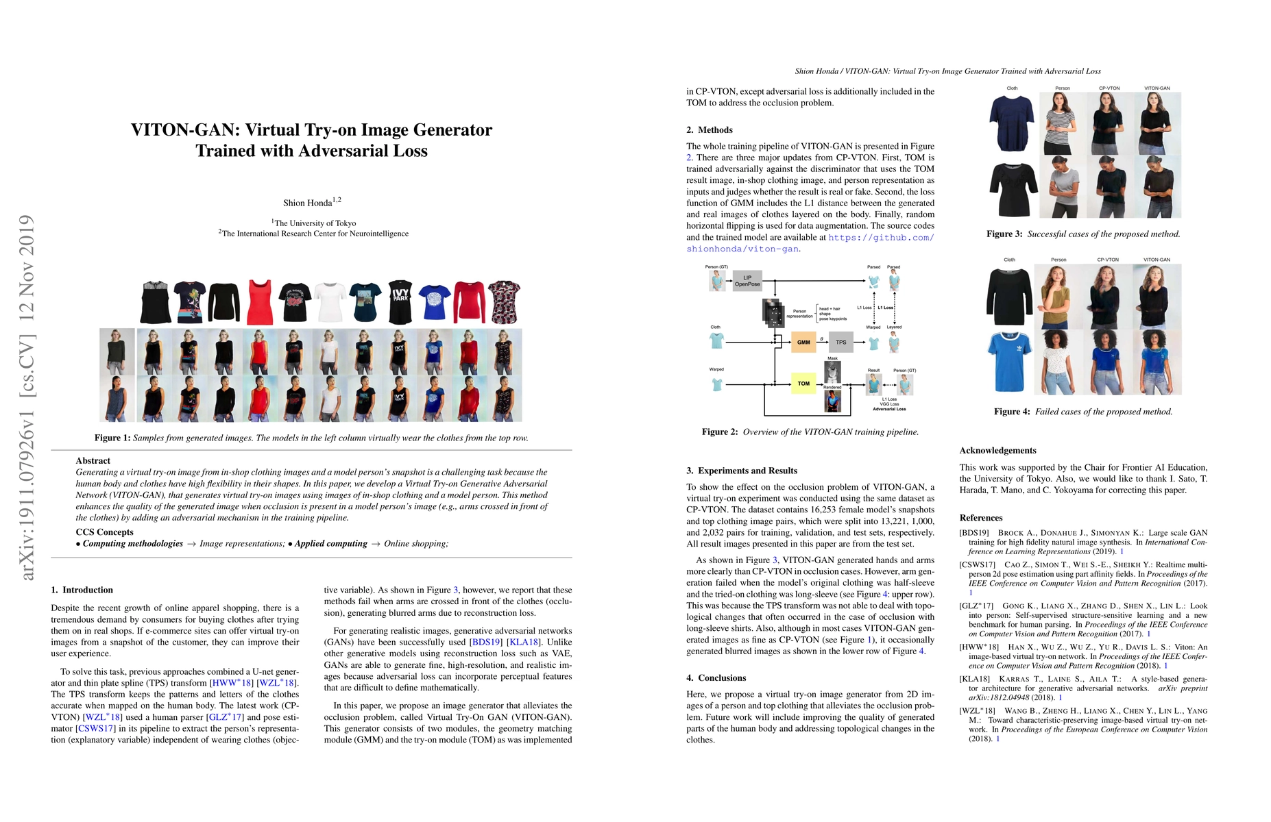 Generating a virtual try-on image from in-shop clothing images and a model person's snapshot is a challenging task because the human body and clothes have high flexibility in their shapes. In this paper, we develop a Virtual Try-on Generative Adversarial Network (VITON-GAN), that generates virtual try-on images using images of in-shop clothing and a model person. This method enhances the quality of the generated image when occlusion is present in a model person's image (e.g., arms crossed in front of the clothes) by adding an adversarial mechanism in the training pipeline.