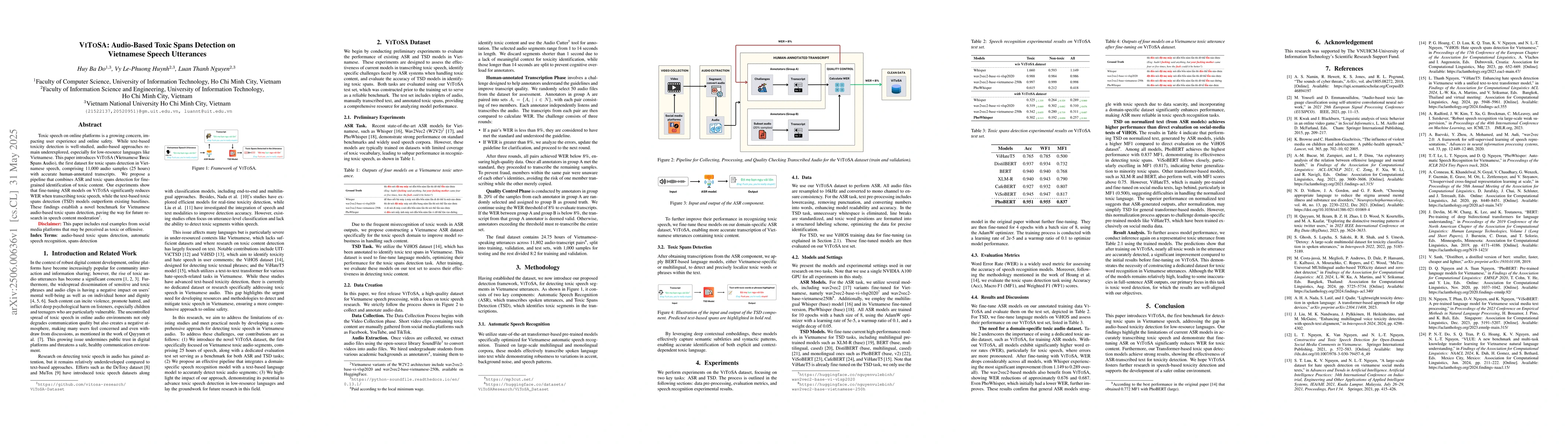 The paper introduces ViToSA, a dataset for detecting toxic speech spans in Vietnamese audio, with a pipeline that combines ASR and text-based detection to improve accuracy.