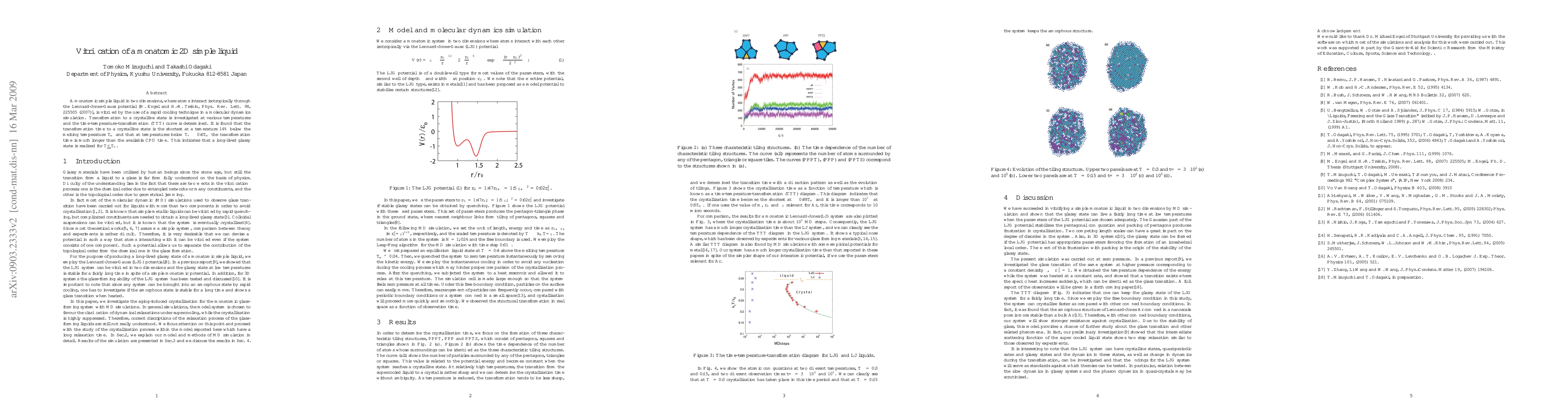This research demonstrates vitrification of a 2D monatomic simple liquid using rapid cooling in molecular dynamics simulations. The study finds an optimal temperature (14% below melting point) for quick crystallization and identifies a temperature threshold (0.6Tm) below which a long-lived glassy state is formed, indicating the existence of a stable glass phase in 2D simple liquids.