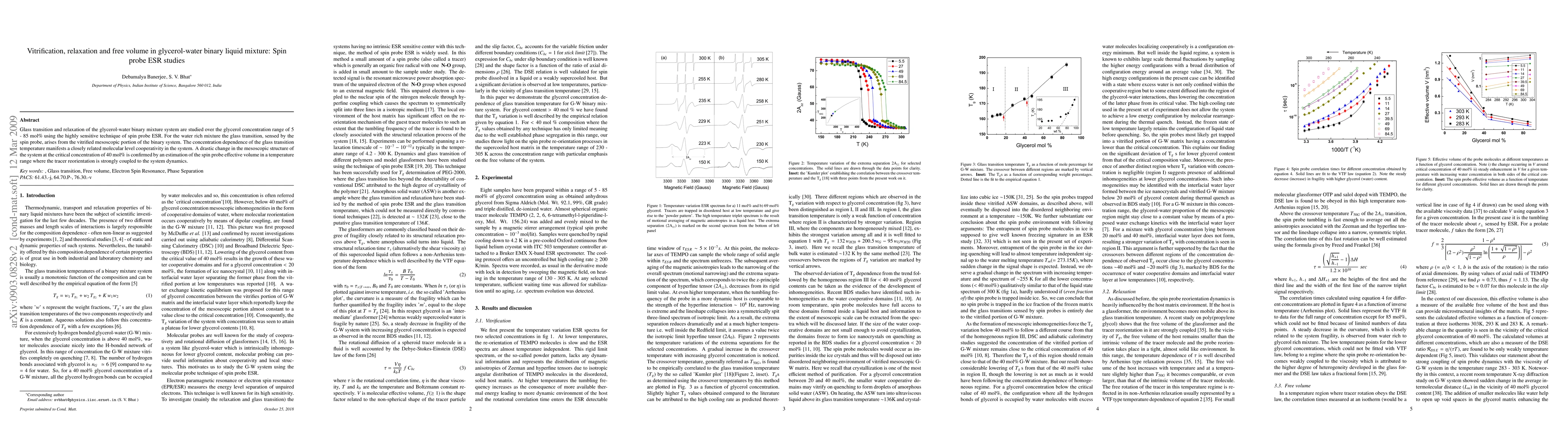 This study uses spin probe ESR to investigate the glass transition and relaxation in glycerol-water mixtures over a glycerol concentration range of 5-85 mol%. The research reveals a significant structural change at 40 mol% glycerol, indicating a cooperative molecular behavior and a shift in the system's mesoscopic structure.
