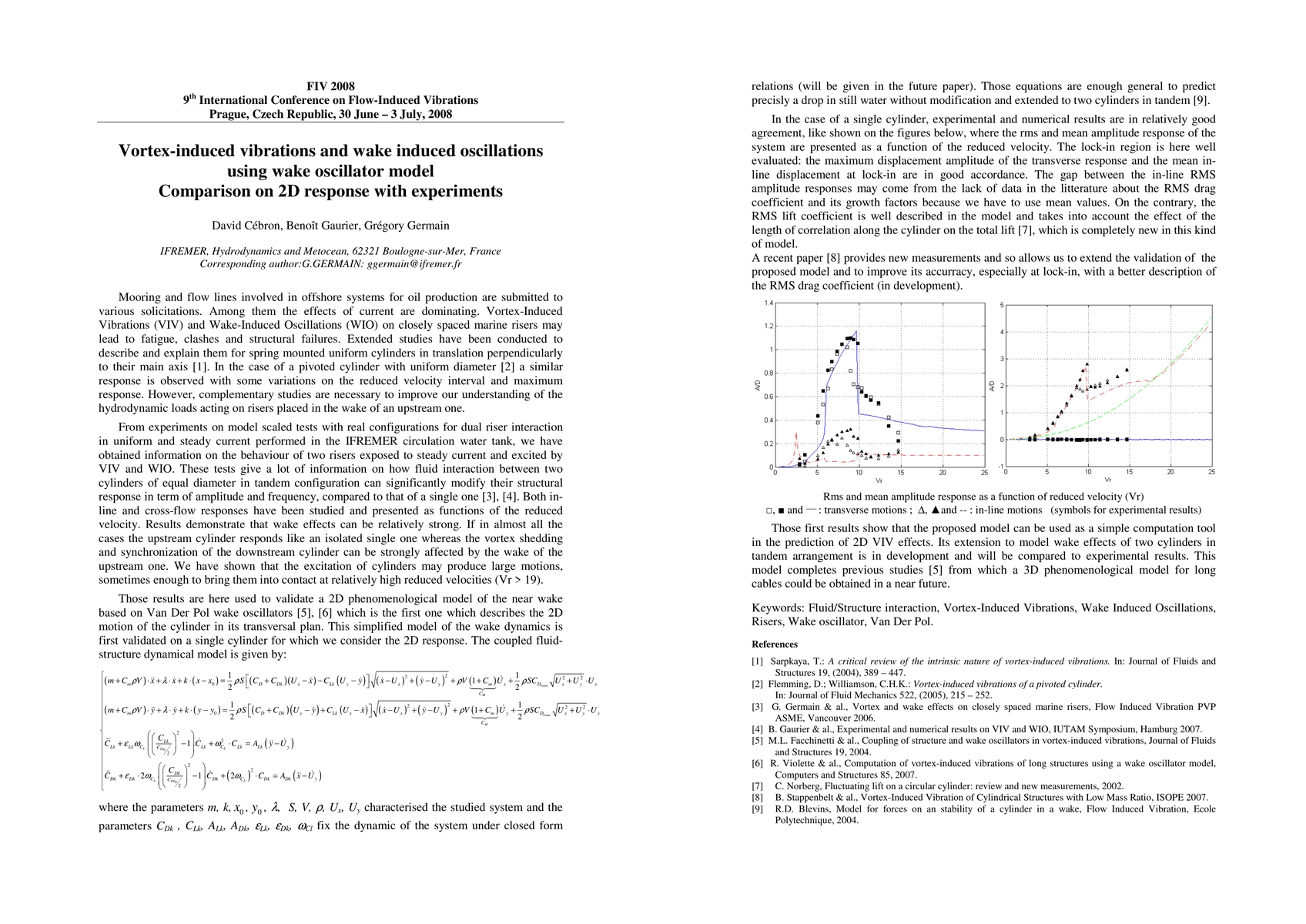 Summary: This paper validates a 2D phenomenological model based on Van Der Pol wake oscillators for predicting vortex-induced vibrations (VIV) of a cylinder, showing good agreement between experimental and numerical results. The model serves as a simple tool for predicting 2D VIV effects.