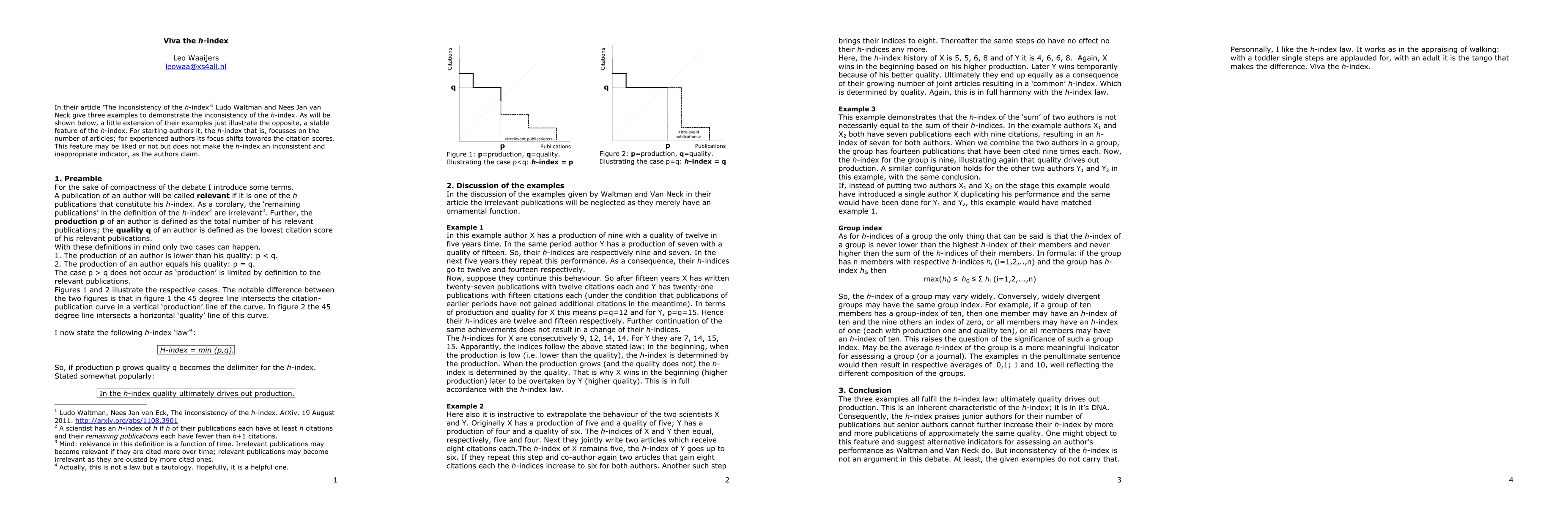Title: Viva the h-index Summary: This paper argues against the inconsistency of the h-index, demonstrating through extended examples that it appropriately shifts focus from the number of articles for new authors to citation scores for experienced ones, thus refuting claims of its inappropriateness.