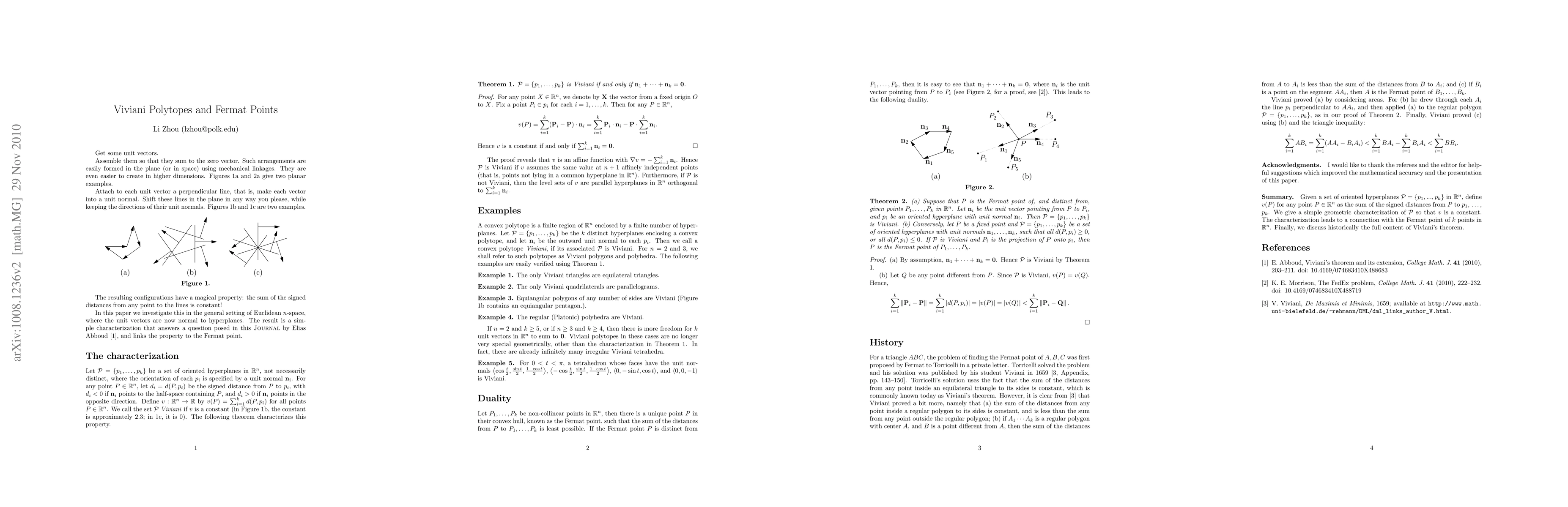 Given a set of oriented hyperplanes $\mathcal{P}=\{p_1, ..., p_k\}$ in $\mathbb{R}^n$, define $v(P)$ for any point $P\in\mathbb{R}^n$ as the sum of the signed distances from $P$ to $p_1$,..., $p_k$. We give a simple geometric characterization of $\mathcal{P}$ so that $v$ is a constant. The characterization leads to a connection with the Fermat point of $k$ points in $\mathbb{R}^n$. Finally, we discuss historically the full content of Viviani's theorem.