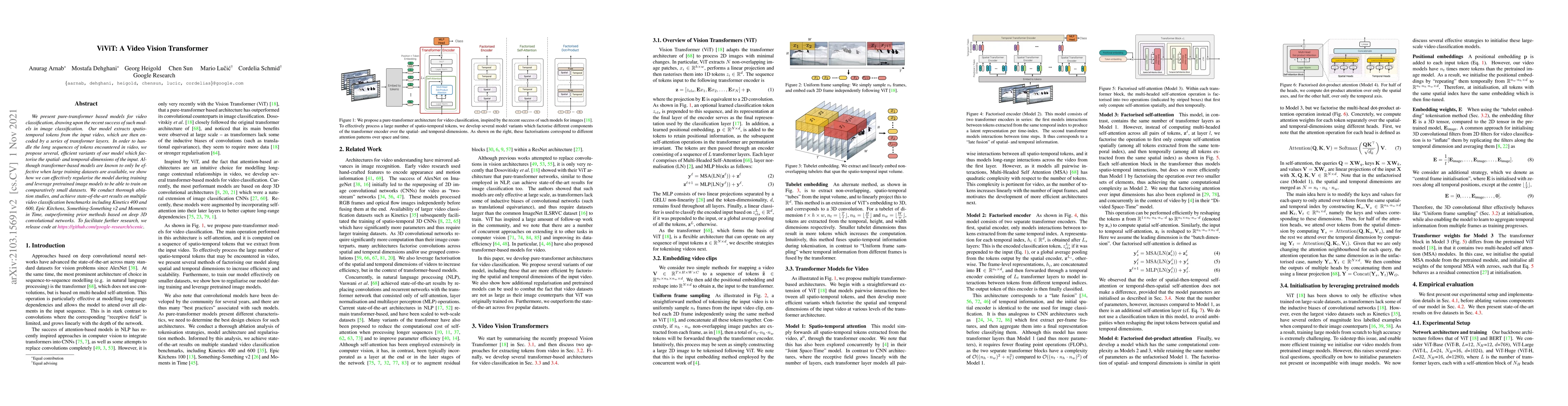 We present pure-transformer based models for video classification, drawing upon the recent success of such models in image classification. Our model extracts spatio-temporal tokens from the input video, which are then encoded by a series of transformer layers. In order to handle the long sequences of tokens encountered in video, we propose several, efficient variants of our model which factorise the spatial- and temporal-dimensions of the input. Although transformer-based models are known to only be effective when large training datasets are available, we show how we can effectively regularise the model during training and leverage pretrained image models to be able to train on comparatively small datasets. We conduct thorough ablation studies, and achieve state-of-the-art results on multiple video classification benchmarks including Kinetics 400 and 600, Epic Kitchens, Something-Something v2 and Moments in Time, outperforming prior methods based on deep 3D convolutional networks. To facilitate further research, we release code at https://github.com/google-research/scenic/tree/main/scenic/projects/vivit