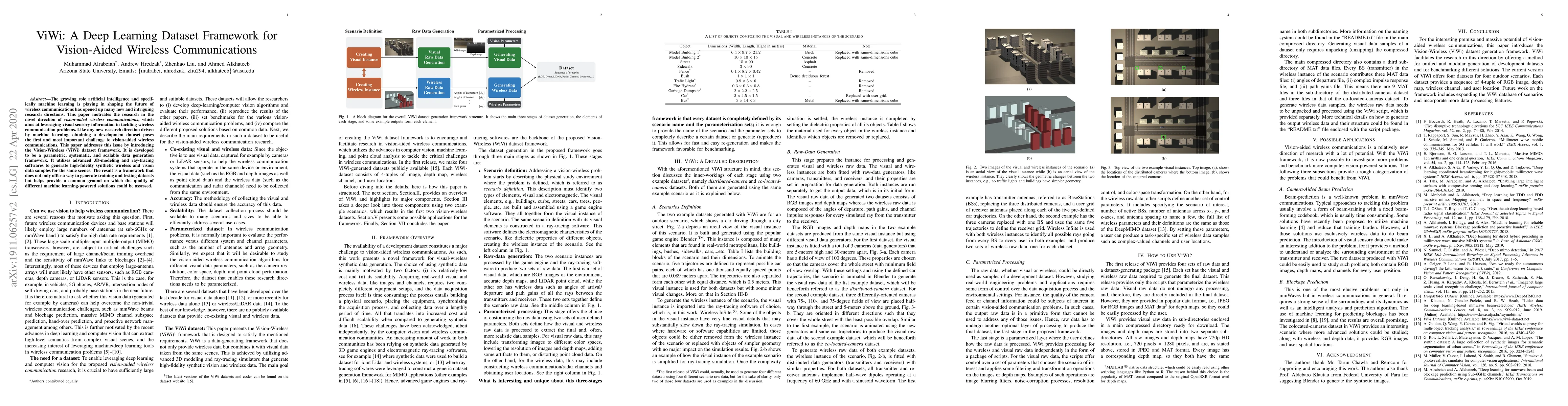 This paper introduces the ViWi dataset framework for vision-aided wireless communications, leveraging visual sensory data to tackle wireless communication challenges. It provides a scalable, parametric data generation framework using 3D-modeling and ray-tracing to create synthetic wireless and vision data, facilitating the development and assessment of machine learning solutions.