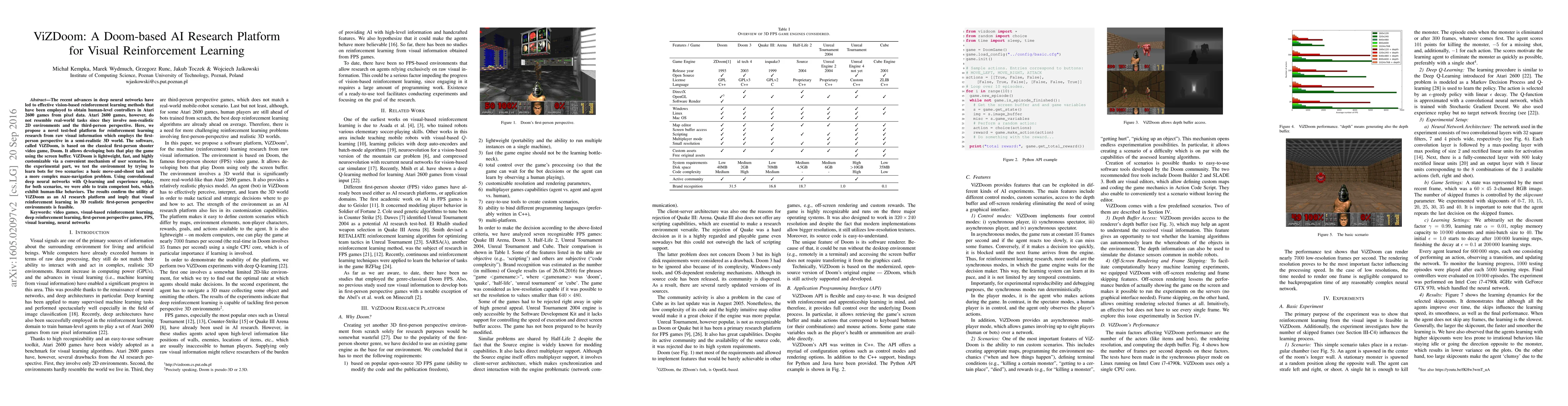 ViZDoom is a new AI research platform based on the game Doom, designed for visual reinforcement learning in 3D first-person environments. Experiments show it can train bots to perform complex tasks like move-and-shoot and maze navigation, demonstrating its potential for realistic AI training.