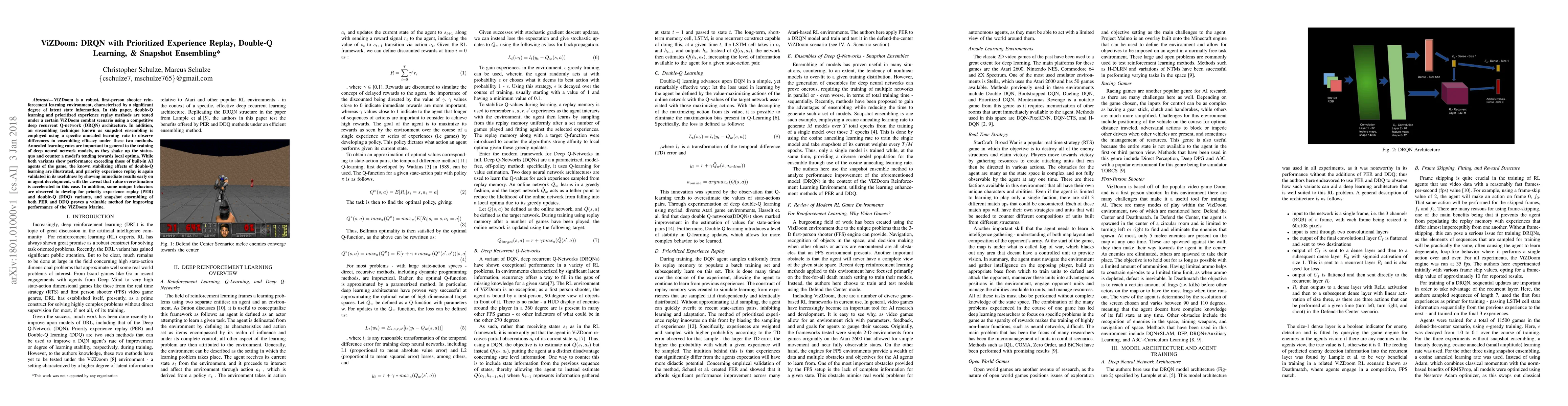 ViZDoom is a robust, first-person shooter reinforcement learning environment, characterized by a significant degree of latent state information. In this paper, double-Q learning and prioritized experience replay methods are tested under a certain ViZDoom combat scenario using a competitive deep recurrent Q-network (DRQN) architecture. In addition, an ensembling technique known as snapshot ensembling is employed using a specific annealed learning rate to observe differences in ensembling efficacy under these two methods. Annealed learning rates are important in general to the training of deep neural network models, as they shake up the status-quo and counter a model's tending towards local optima. While both variants show performance exceeding those of built-in AI agents of the game, the known stabilizing effects of double-Q learning are illustrated, and priority experience replay is again validated in its usefulness by showing immediate results early on in agent development, with the caveat that value overestimation is accelerated in this case. In addition, some unique behaviors are observed to develop for priority experience replay (PER) and double-Q (DDQ) variants, and snapshot ensembling of both PER and DDQ proves a valuable method for improving performance of the ViZDoom Marine.