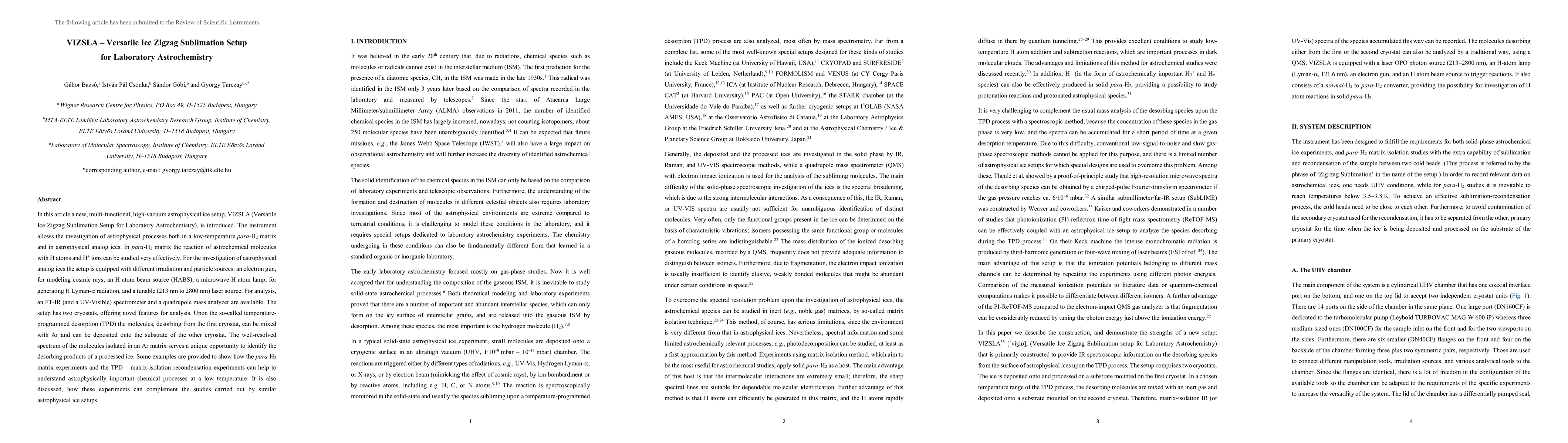 The VIZSLA setup is a versatile high-vacuum instrument for laboratory astrochemistry, enabling the study of astrochemical reactions in low-temperature para-H2 matrices and astrophysical analog ices. It features various irradiation and particle sources, along with FT-IR and UV-Visible spectrometers, to analyze complex astrophysical processes.