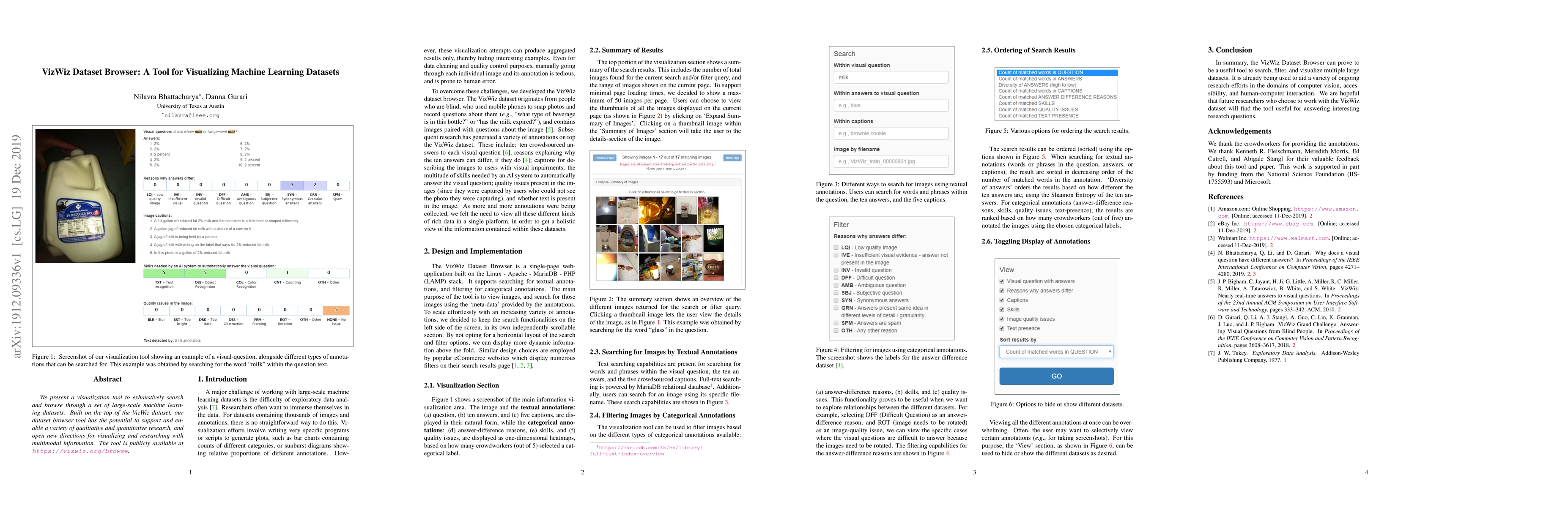 The VizWiz Dataset Browser is a visualization tool designed for exhaustively searching and browsing large-scale machine learning datasets, built on the VizWiz dataset, and it aims to facilitate qualitative and quantitative research in multimodal information. The tool is publicly accessible at https://vizwiz.org/browse.