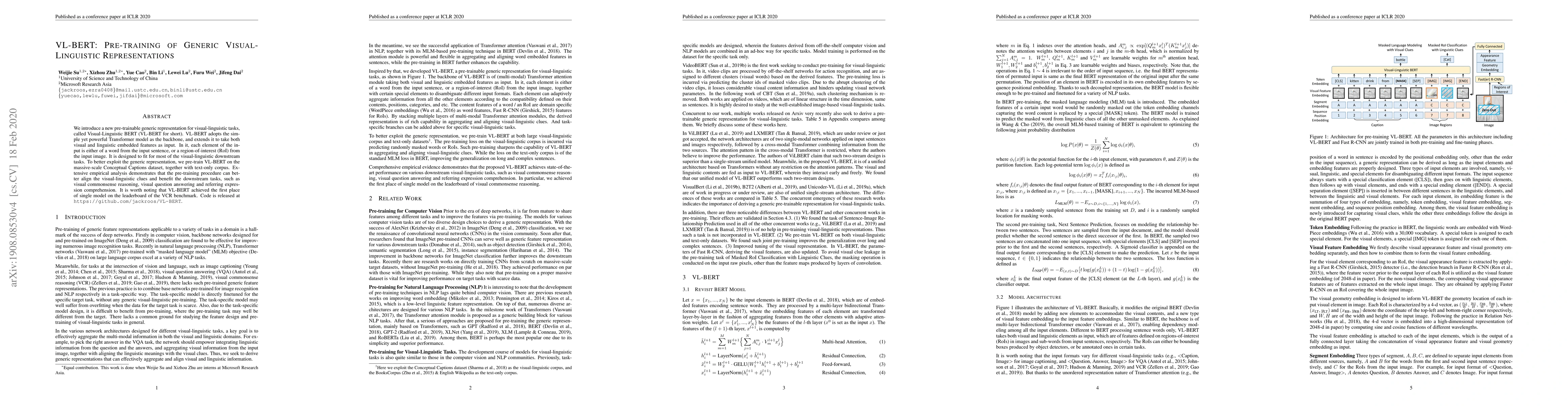 VL-BERT is a pre-trained visual-linguistic representation model based on the Transformer architecture, designed to handle both visual and linguistic inputs. Pre-trained on large datasets, it shows improved performance on various visual-linguistic tasks like visual commonsense reasoning and visual question answering.
