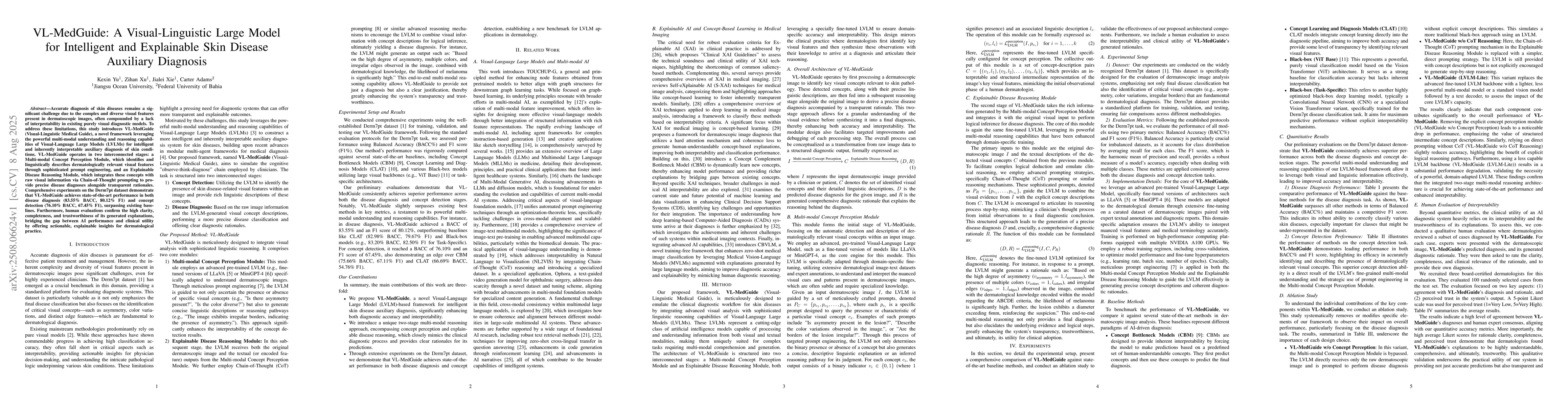 Accurate diagnosis of skin diseases remains a significant challenge due to the complex and diverse visual features present in dermatoscopic images, often compounded by a lack of interpretability in existing purely visual diagnostic models. To address these limitations, this study introduces VL-MedGuide (Visual-Linguistic Medical Guide), a novel framework leveraging the powerful multi-modal understanding and reasoning capabilities of Visual-Language Large Models (LVLMs) for intelligent and inherently interpretable auxiliary diagnosis of skin conditions. VL-MedGuide operates in two interconnected stages: a Multi-modal Concept Perception Module, which identifies and linguistically describes dermatologically relevant visual features through sophisticated prompt engineering, and an Explainable Disease Reasoning Module, which integrates these concepts with raw visual information via Chain-of-Thought prompting to provide precise disease diagnoses alongside transparent rationales. Comprehensive experiments on the Derm7pt dataset demonstrate that VL-MedGuide achieves state-of-the-art performance in both disease diagnosis (83.55% BACC, 80.12% F1) and concept detection (76.10% BACC, 67.45% F1), surpassing existing baselines. Furthermore, human evaluations confirm the high clarity, completeness, and trustworthiness of its generated explanations, bridging the gap between AI performance and clinical utility by offering actionable, explainable insights for dermatological practice.