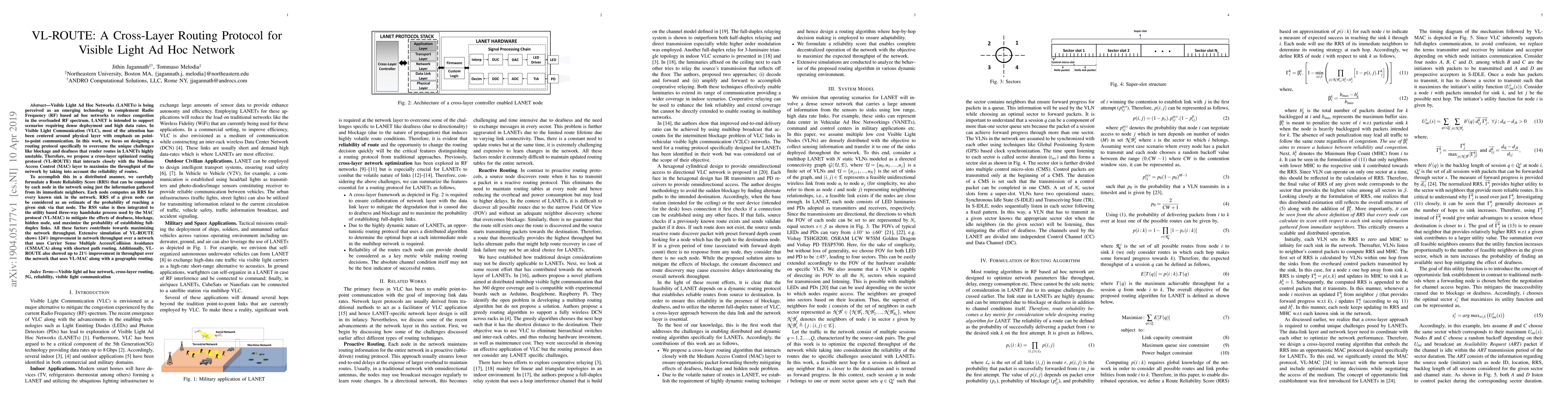 The paper proposes VL-ROUTE, a cross-layer routing protocol for Visible Light Ad Hoc Networks (LANETs) to address instability due to blockage and deafness. It introduces a Route Reliability Score (RRS) that enhances throughput by integrating with the VL-MAC protocol, showing a 124% improvement over CSMA/CA with shortest path routing and a 21% improvement over VL-MAC with geographic routing.