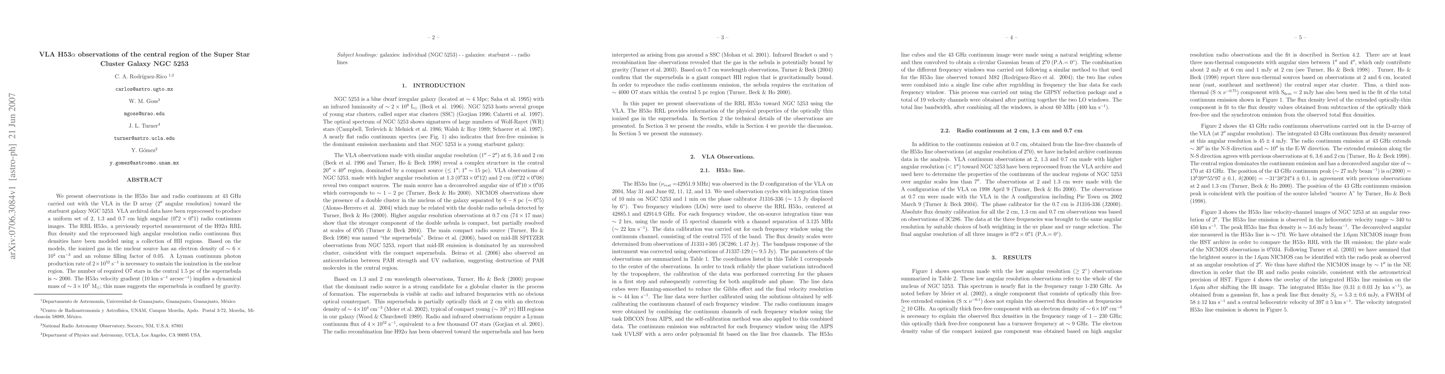 This paper presents VLA observations of the starburst galaxy NGC 5253, revealing high-resolution radio continuum and H53alpha line data. The study models the ionized gas, finding a high electron density and a significant Lyman continuum photon production rate, indicating the presence of around 2000 O7 stars in the central region.