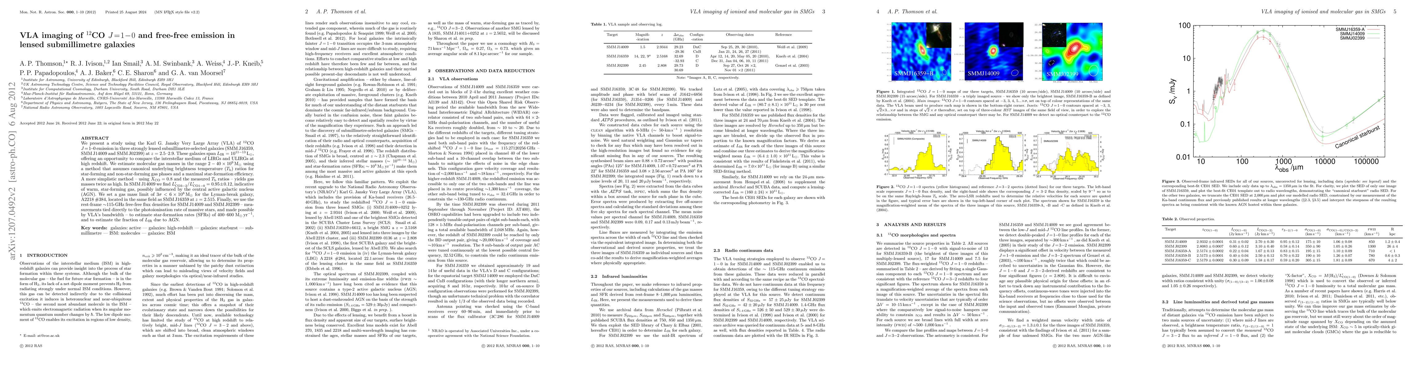 We present a study using the Karl G. Jansky Very Large Array of 12CO J=1-0 emission in three strongly lensed submillimetre-selected galaxies (SMMJ16359, SMMJ14009 and SMMJ02399) at z=2.5-2.9. These galaxies span L(IR) = 10^11 - 10^13 Lsun, offering an opportunity to compare the interstellar medium of LIRGs and ULIRGs at high redshift. We estimate molecular gas masses in the range (2-40) x 10^9 Msun using a method that assumes canonical underlying brightness temperature ratios for star-forming and non-star-forming gas phases and a maximal star-formation efficiency. A more simplistic method using X(CO) = 0.8 yields gas masses twice as high. The observed CO(3-2)/CO(1-0) brightness temperature ratio for SMMJ14009, r(3-2)/(1-0) = (0.95 \pm 0.12), is indicative of warm star-forming gas, possibly influenced by the central AGN. We search for 12CO(1-0) emission in the Lyman-break galaxy, A2218 #384, located at z=2.517 in the same field as SMMJ16359, and assign a 3-sigma gas mass limit of <6 x 10^8 Msun. We use rest-frame 115-GHz free-free flux densities in SMMJ14009 and SMMJ02399 - measurements tied directly to the photionisation rate of massive stars and made possible by the VLA's bandwidth - to estimate star-formation rates of 400-600 Msun/yr and to estimate the fraction of L(IR) due to the AGN.