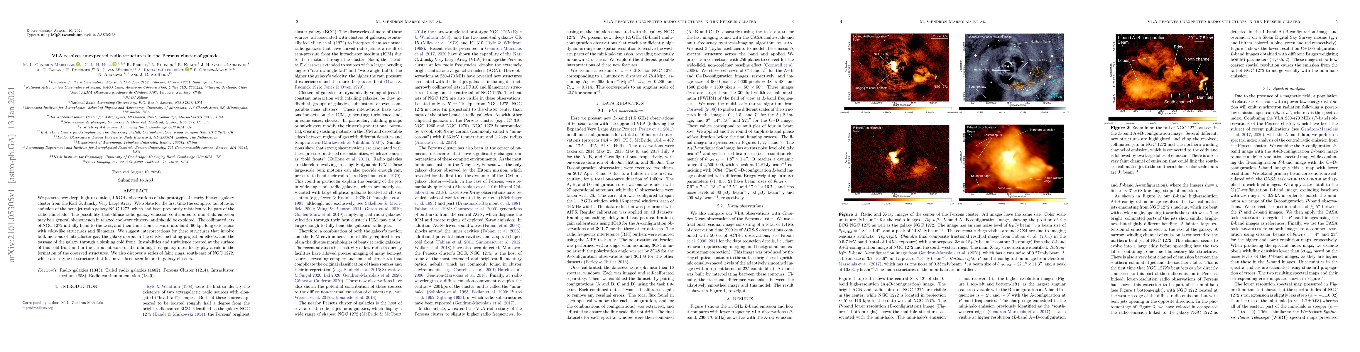 We present new deep, high-resolution, 1.5 GHz observations of the prototypical nearby Perseus galaxy cluster from the Karl G. Jansky Very Large Array. We isolate for the first time the complete tail of radio emission of the bent-jet radio galaxy NGC 1272, which had been previously mistaken to be part of the radio mini-halo. The possibility that diffuse radio galaxy emission contributes to mini-halo emission may be a general phenomenon in relaxed cool-core clusters, and should be explored. The collimated jets of NGC 1272 initially bend to the west, and then transition eastward into faint, 60 kpc-long extensions with eddy-like structures and filaments. We suggest interpretations for these structures that involve bulk motions of intracluster gas, the galaxy's orbit in the cluster including projection effects, and the passage of the galaxy through a sloshing cold front. Instabilities and turbulence created at the surface of this cold front and in the turbulent wake of the infalling host galaxy most likely play a role in the formation of the observed structures. We also discover a series of faint rings, south-east of NGC 1272, which are a type of structure that has never been seen before in galaxy clusters.