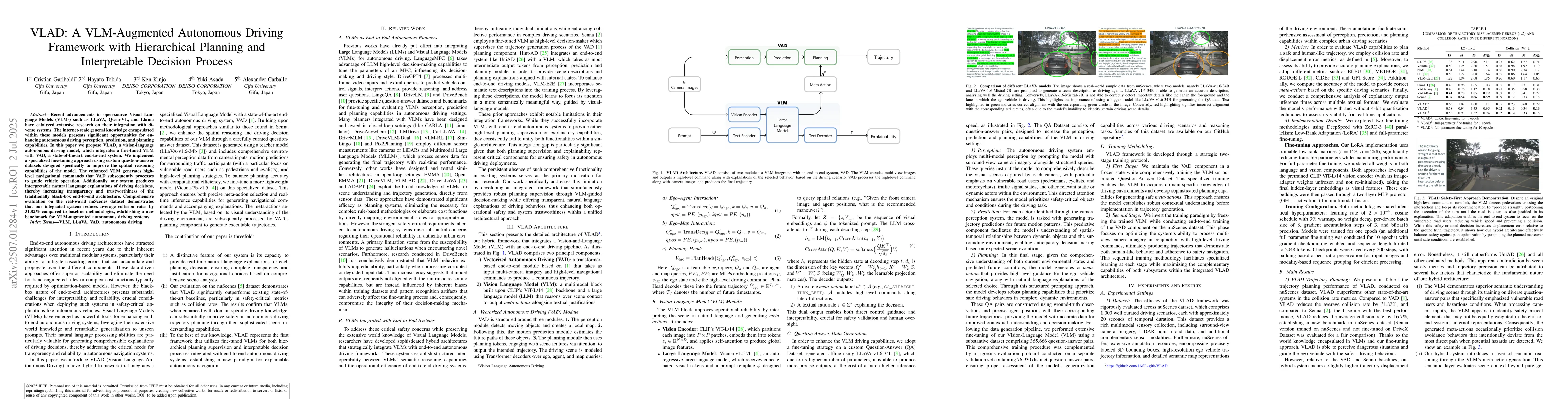 Recent advancements in open-source Visual Language Models (VLMs) such as LLaVA, Qwen-VL, and Llama have catalyzed extensive research on their integration with diverse systems. The internet-scale general knowledge encapsulated within these models presents significant opportunities for enhancing autonomous driving perception, prediction, and planning capabilities. In this paper we propose VLAD, a vision-language autonomous driving model, which integrates a fine-tuned VLM with VAD, a state-of-the-art end-to-end system. We implement a specialized fine-tuning approach using custom question-answer datasets designed specifically to improve the spatial reasoning capabilities of the model. The enhanced VLM generates high-level navigational commands that VAD subsequently processes to guide vehicle operation. Additionally, our system produces interpretable natural language explanations of driving decisions, thereby increasing transparency and trustworthiness of the traditionally black-box end-to-end architecture. Comprehensive evaluation on the real-world nuScenes dataset demonstrates that our integrated system reduces average collision rates by 31.82% compared to baseline methodologies, establishing a new benchmark for VLM-augmented autonomous driving systems.