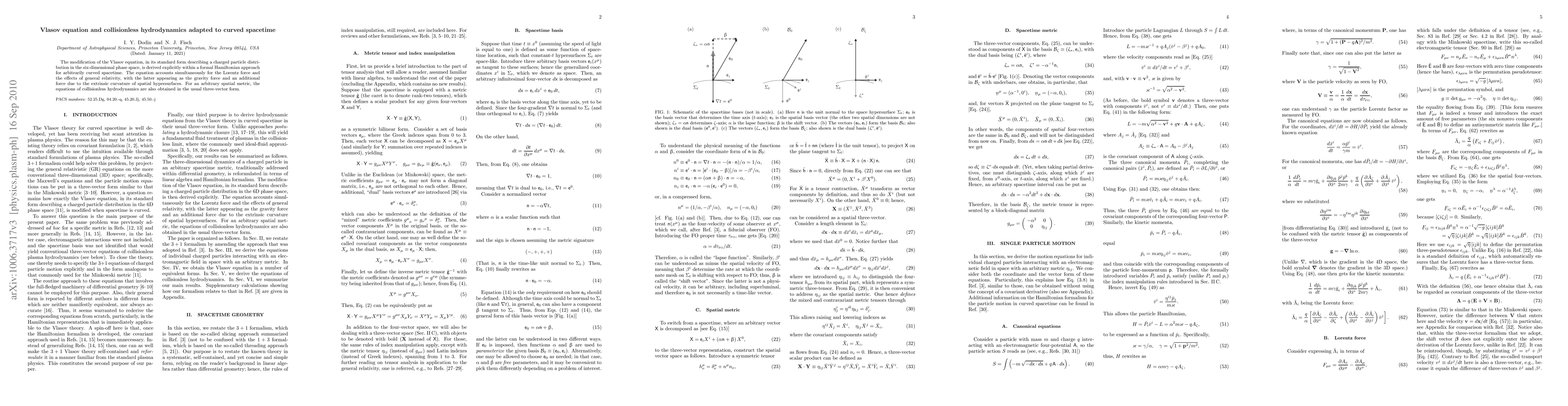This paper derives the modified Vlasov equation for charged particles in curved spacetime, incorporating both Lorentz and general relativistic forces. It also obtains the equations of collisionless hydrodynamics in three-vector form for arbitrary spatial metrics.