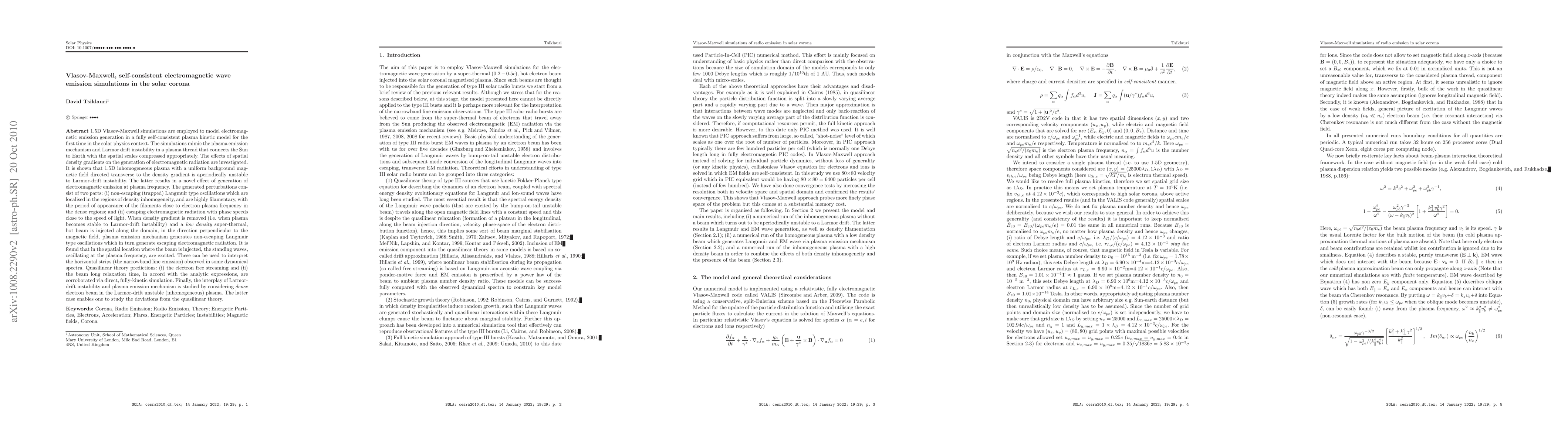 1.5D Vlasov-Maxwell simulations are employed to model electromagnetic emission generation in a fully self-consistent plasma kinetic model for the first time in the solar physics context. The simulations mimic the plasma emission mechanism and Larmor drift instability in a plasma thread that connects the Sun to Earth with the spatial scales compressed appropriately. The effects of spatial density gradients on the generation of electromagnetic radiation are investigated. It is shown that 1.5D inhomogeneous plasma with a uniform background magnetic field directed transverse to the density gradient is aperiodically unstable to Larmor-drift instability. The latter results in a novel effect of generation of electromagnetic emission at plasma frequency. When density gradient is removed (i.e. when plasma becomes stable to Larmor-drift instability) and a $low$ density, super-thermal, hot beam is injected along the domain, in the direction perpendicular to the magnetic field, plasma emission mechanism generates non-escaping Langmuir type oscillations which in turn generate escaping electromagnetic radiation. It is found that in the spatial location where the beam is injected, the standing waves, oscillating at the plasma frequency, are excited. These can be used to interpret the horizontal strips observed in some dynamical spectra. Quasilinear theory predictions: (i) the electron free streaming and (ii) the beam long relaxation time, in accord with the analytic expressions, are corroborated via direct, fully-kinetic simulation. Finally, the interplay of Larmor-drift instability and plasma emission mechanism is studied by considering $dense$ electron beam in the Larmor-drift unstable (inhomogeneous) plasma. http://www.maths.qmul.ac.uk/~tsiklauri/movie1.mpg * http://www.maths.qmul.ac.uk/~tsiklauri/movie2.mpg * http://www.maths.qmul.ac.uk/~tsiklauri/movie3.mpg