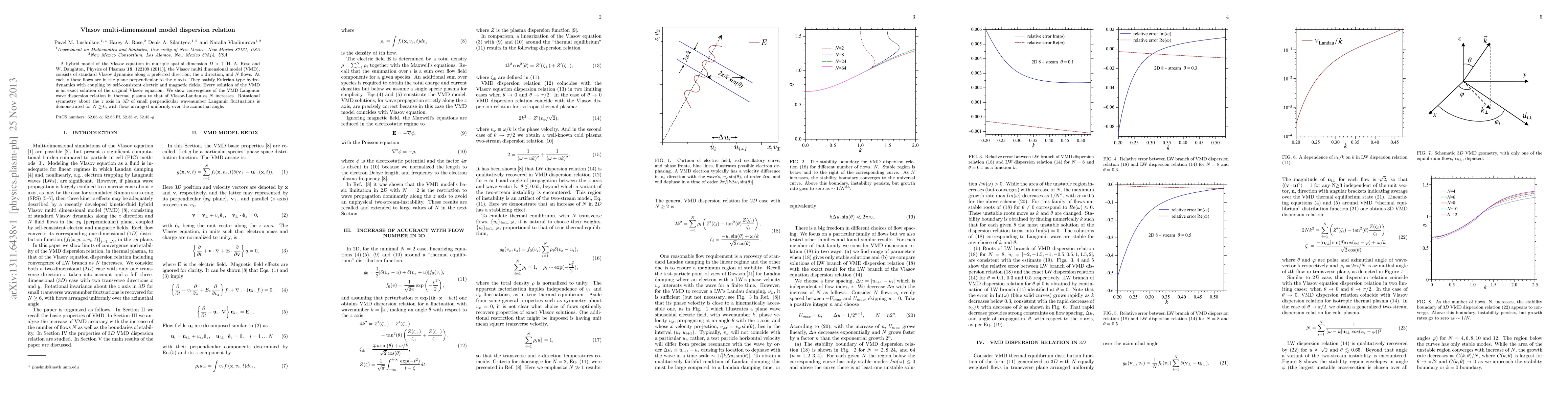 A hybrid model of the Vlasov equation in multiple spatial dimension $D>1$ [H. A. Rose and W. Daughton, Physics of Plasmas v. 18, 122109 (2011)], the Vlasov multi dimensional model (VMD), consists of standard Vlasov dynamics along a preferred direction, the $z$ direction, and $N$ flows. At each $z$ these flows are in the plane perpendicular to the $z$ axis. They satisfy Eulerian-type hydrodynamics with coupling by self-consistent electric and magnetic fields. Every solution of the VMD is an exact solution of the original Vlasov equation. We show convergence of the VMD Langmuir wave dispersion relation in thermal plasma to that of Vlasov-Landau as $N$ increases. Rotational symmetry about the $z$ axis in $3D$ of small perpendicular wavenumber Langmuir fluctuations is demonstrated for $N\geq 6$, with flows arranged uniformly over the azimuthal angle.