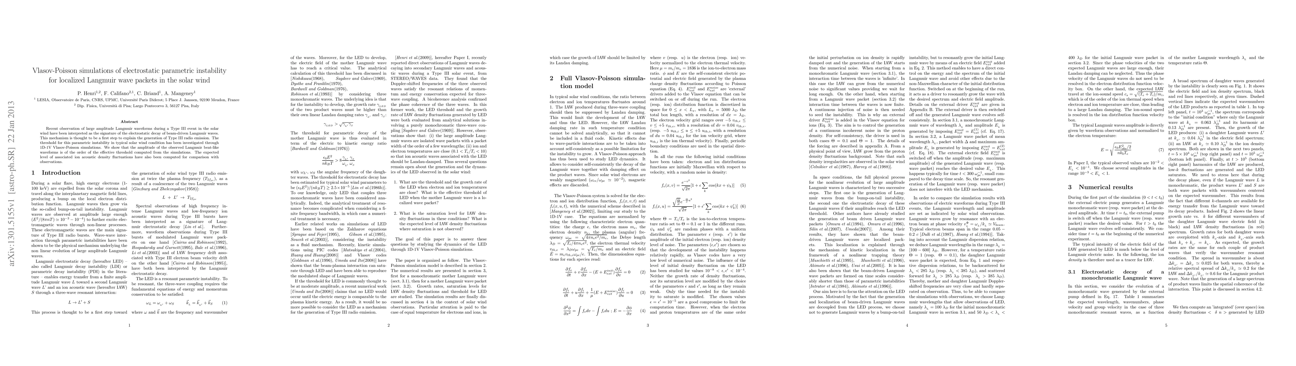 This paper investigates the electrostatic parametric instability in the solar wind using Vlasov-Poisson simulations, finding that the amplitude of observed Langmuir waveforms aligns with the computed threshold for the instability. The study also predicts associated ion acoustic density fluctuations for comparison with observational data.