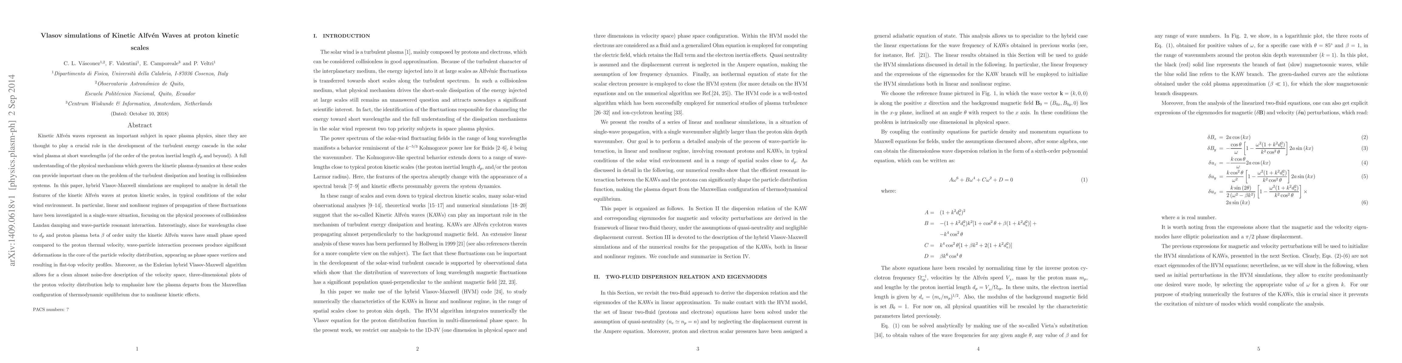 This paper uses hybrid Vlasov-Maxwell simulations to investigate kinetic Alfvén waves in the solar wind, focusing on their linear and nonlinear regimes. It reveals significant deformations in proton velocity distributions due to wave-particle interactions, resulting in phase space vortices and flat-top velocity profiles, highlighting the departure from Maxwellian equilibrium in kinetic plasma dynamics.
