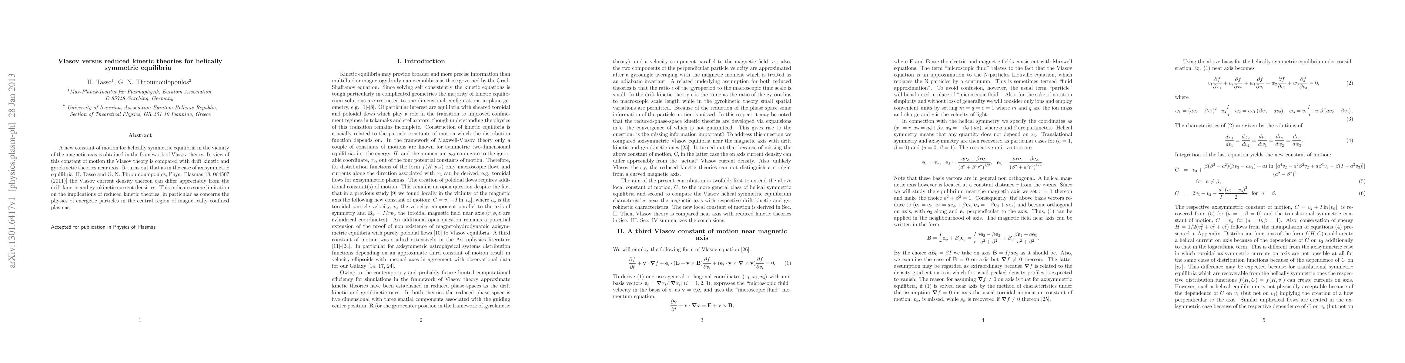 This paper introduces a new constant of motion for helically symmetric equilibria in Vlasov theory and compares it with drift and gyrokinetic theories. It finds significant discrepancies in current densities, suggesting limitations of reduced kinetic theories in understanding energetic particles near the magnetic axis.