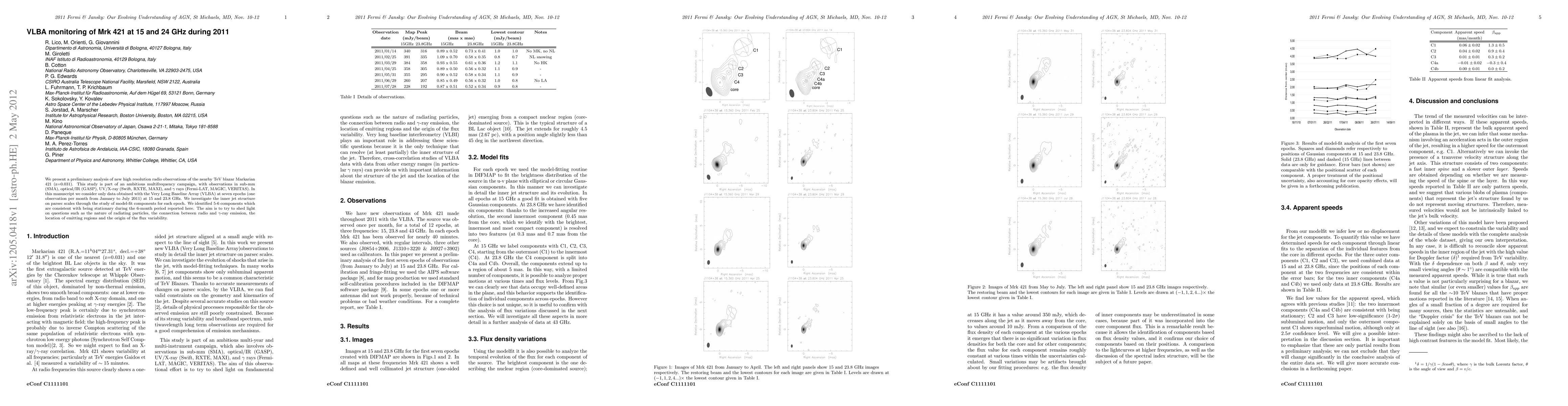 We present a preliminary analysis of new high resolution radio observations of the nearby TeV blazar Markarian 421 (z=0.031). This study is part of an ambitious multifrequency campaign, with observations in sub-mm (SMA), optical/IR (GASP), UV/X-ray (Swift, RXTE, MAXI), and gamma rays (Fermi-LAT, MAGIC, VERITAS). In this manuscript we consider only data obtained with the Very Long Baseline Array (VLBA) at seven epochs (one observation per month from January to July 2011) at 15 and 23.8 GHz. We investigate the inner jet structure on parsec scales through the study of model-fit components for each epoch. We identified 5-6 components which are consistent with being stationary during the 6-month period reported here. The aim is to try to shed light on questions such as the nature of radiating particles, the connection between radio and gamma-ray emission, the location of emitting regions and the origin of the flux variability.