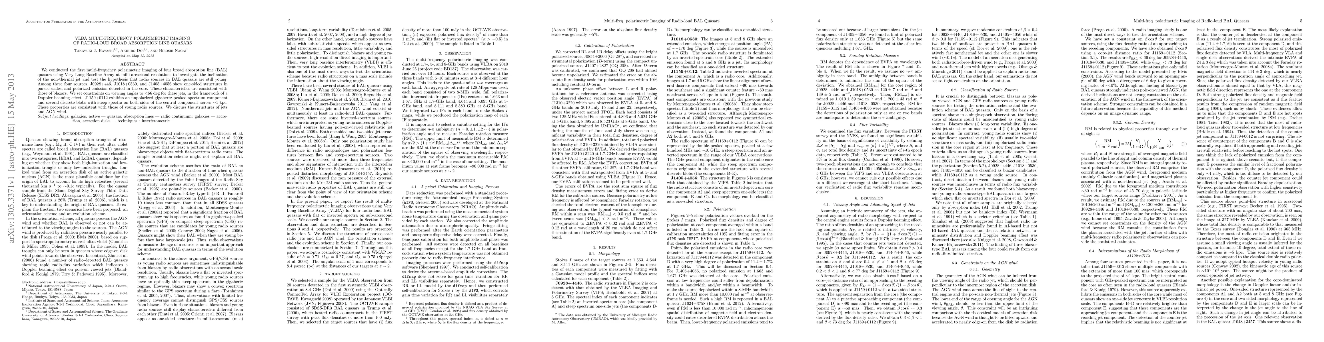 We conducted the first multi-frequency polarimetric imaging of four broad absorption line (BAL) quasars using Very Long Baseline Array at milli-arcsecond resolutions to investigate the inclination of the non-thermal jet and test the hypothesis that radio sources in BAL quasars are still young. Among these four sources, J0928+446, J1018+0530, and J1405+4056 show one-sided structures in parsec scales, and polarized emission detected in the core. These characteristics are consistent with those of blazars. We set constraints on viewing angles to $<$66 deg for these jets, in the framework of a Doppler beaming effect. J1159+0112 exhibits an unpolarized gigahertz peaked spectrum component and several discrete blobs with steep spectra on both sides of the central component across $\sim$1 kpc. These properties are consistent with those of young radio sources. We discuss the structures of jets and AGN wind.
