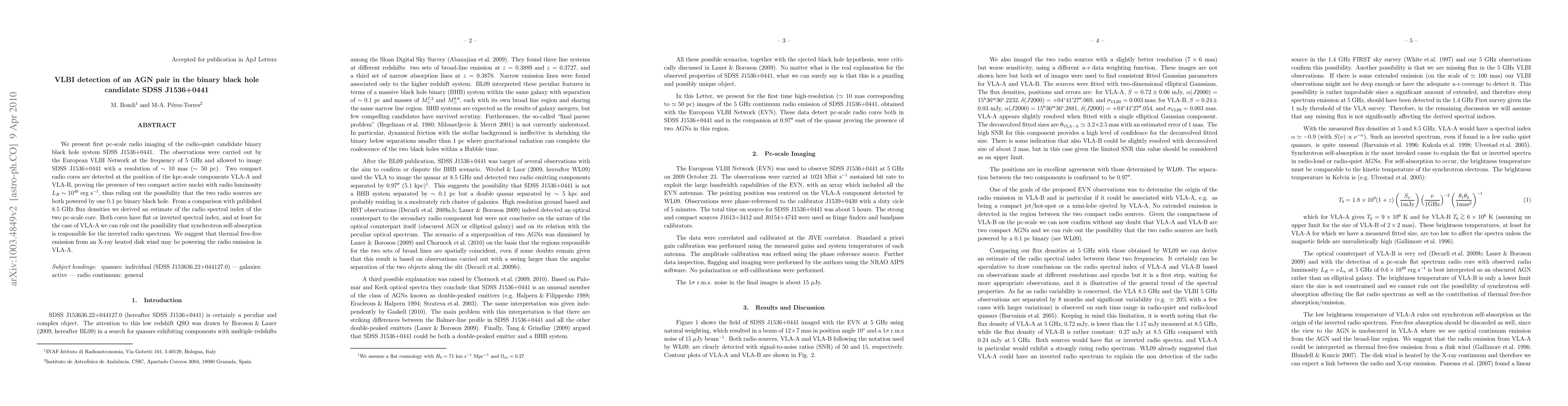 We present first pc-scale radio imaging of the radio-quiet candidate binary black hole system SDSS J1536+0441. The observations were carried out by the European VLBI Network at the frequency of 5 GHz and allowed to image SDSS J1536+0441 with a resolution of about 10 mas (50 pc). Two compact radio cores are detected at the position of the kpc-scale components VLA-A and VLA-B, proving the presence of two compact active nuclei with radio luminosity about 10^{40} erg/s, thus ruling out the possibility that the two radio sources are both powered by one 0.1 pc binary black hole. From a comparison with published 8.5 GHz flux densities we derived an estimate of the radio spectral index of the two pc-scale cores. Both cores have flat or inverted spectral index and, at least for the case of VLA-A, we can rule out the possibility that synchrotron self-absorption is responsible for the inverted radio spectrum. We suggest that thermal free-free emission from an X-ray heated disk wind may be powering the radio emission in VLA-A.