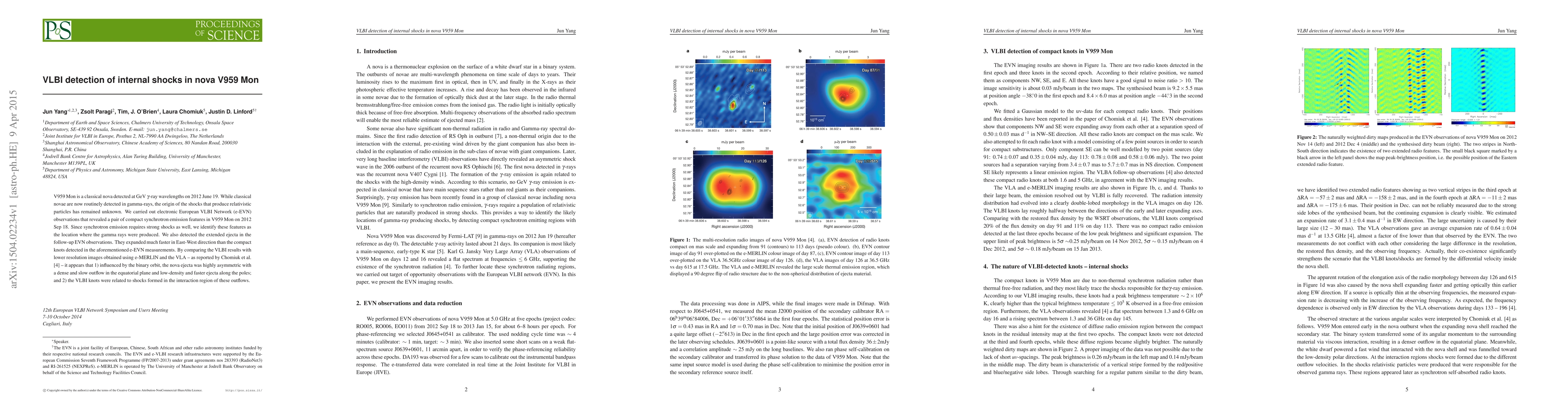 The VLBI observations of classical nova V959 Mon revealed compact synchrotron emission features, identified as the origin of GeV gamma rays, and showed that the ejecta expanded asymmetrically, influenced by the binary orbit, with dense, slow outflows near the equatorial plane and faster, less dense ejecta along the poles. The VLBI knots correspond to shocks in the interaction region of these asymmetric outflows.
