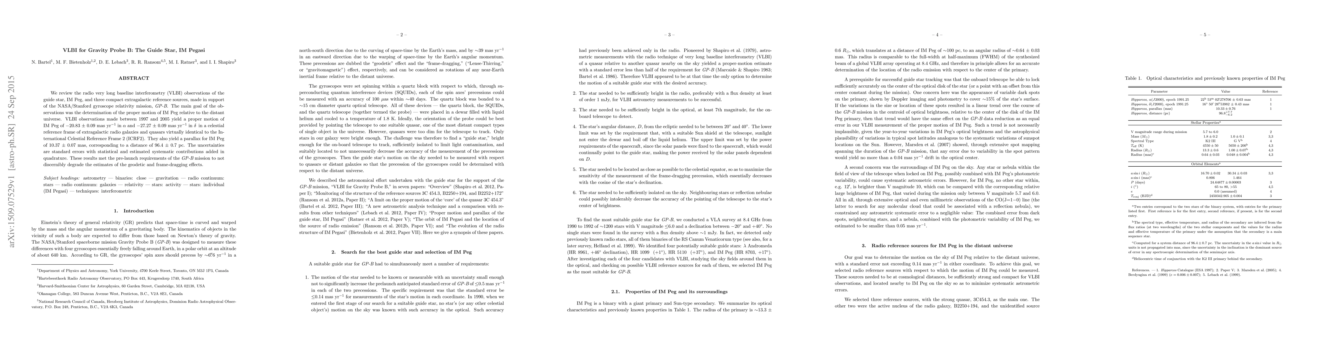 We review the radio very long baseline interferometry (VLBI) observations of the guide star, IM Peg, and three compact extragalactic reference sources, 3C 454.3, B2250+194, and B2252+172, made in support of the NASA/Stanford gyroscope relativity mission, GP-B. The main goal of the observations was the determination of the proper motion of IM Peg relative to the distant universe. VLBI observations made between 1997 and 2005 yield a proper motion of IM Peg of -20.83 $\pm$ 0.09 mas yr$^{-1}$ in RA and -27.27 $\pm$ 0.09 mas yr$^{-1}$ in dec, in a celestial reference frame of extragalactic radio galaxies and quasars virtually identical to the International Celestial Reference Frame 2 (ICRF2). They also yield a parallax for IM Peg of 10.37 $\pm$ 0.07 mas, corresponding to a distance of 96.4 $\pm$ 0.7 pc. The uncertainties are standard errors with statistical and estimated systematic contributions added in quadrature. These results met the pre-launch requirements of the GP-B mission to not discernibly degrade the estimates of the geodetic and frame-dragging effects. The paper also reports on a 1$\sigma$ upper limit on the magnitude of the components of the proper motion of the 'core' of 3C 454.3 relative to the ICRF2 of 46 and 56 $\mu$as yr$^{-1}$ in RA and dec, respectively, and presents densely sampled ellipses of the parallax and the orbit of the giant of the binary system. It further gives a sequence of images of the flickering radio emission relative to the disk of the giant. For a 'movie of a star,' see http://www.yorku.ca/bartel/impeg.mpg .