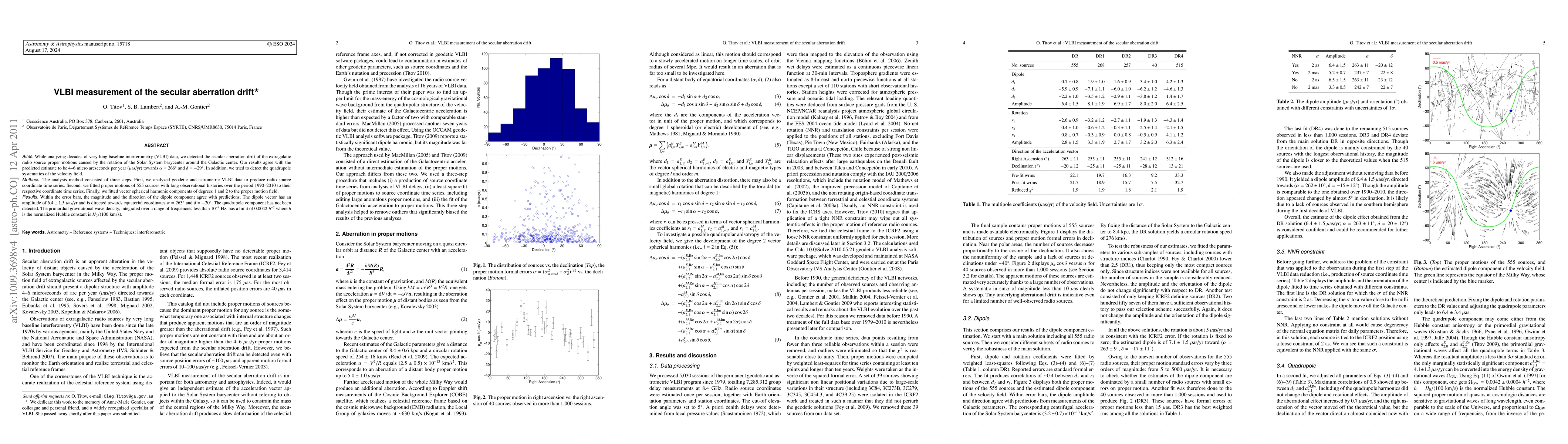 This study analyzes VLBI data to detect the secular aberration drift of extragalactic radio sources due to the Solar System's barycenter rotation, finding a drift of 4-6 μas/yr, consistent with predictions. The analysis also detected a dipole component in the proper motion field but did not detect a quadrupole component, setting a limit on primordial gravitational wave density.