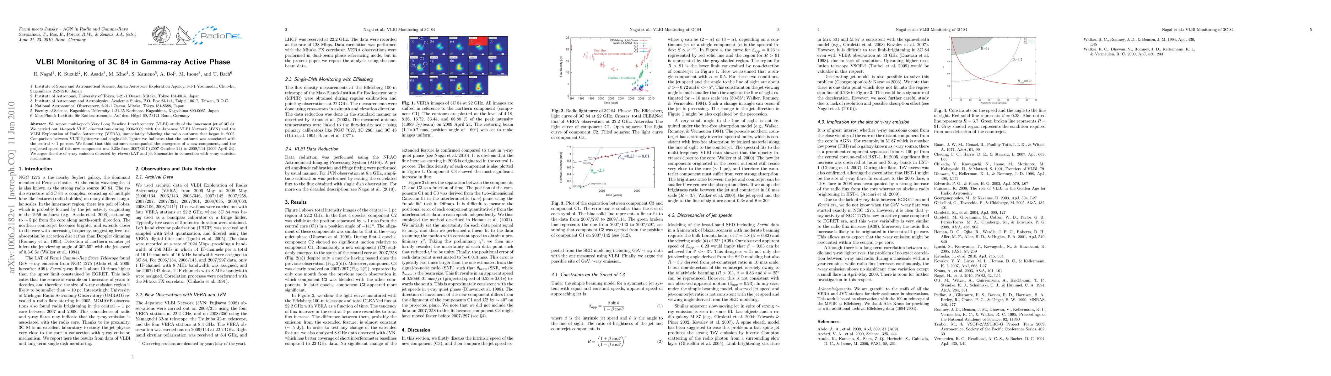 This study used high-resolution radio observations to track the innermost jet of galaxy 3C 84 during a gamma-ray active phase, revealing a new jet component emerging during an outburst. The findings suggest a connection between the jet's behavior and gamma-ray emission detected by Fermi/LAT.