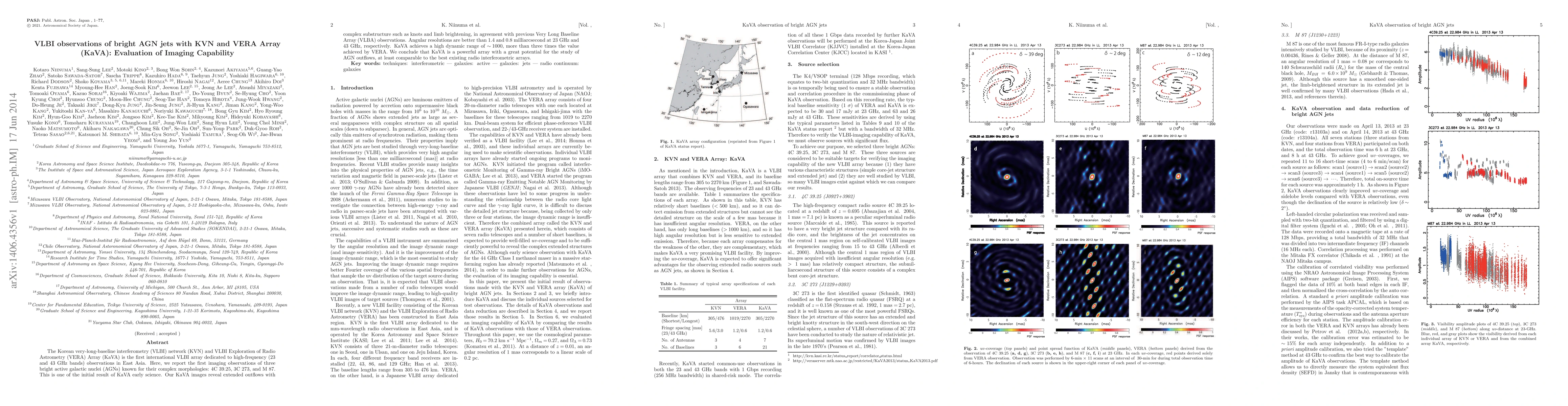 The KVN and VERA Array (KaVA) demonstrates high-resolution imaging capabilities for bright AGN jets, revealing complex structures like knots and limb brightening in 4C 39.25, 3C 273, and M 87, with angular resolutions better than 1.4 and 0.8 milliarcseconds at 23 and 43 GHz, respectively.