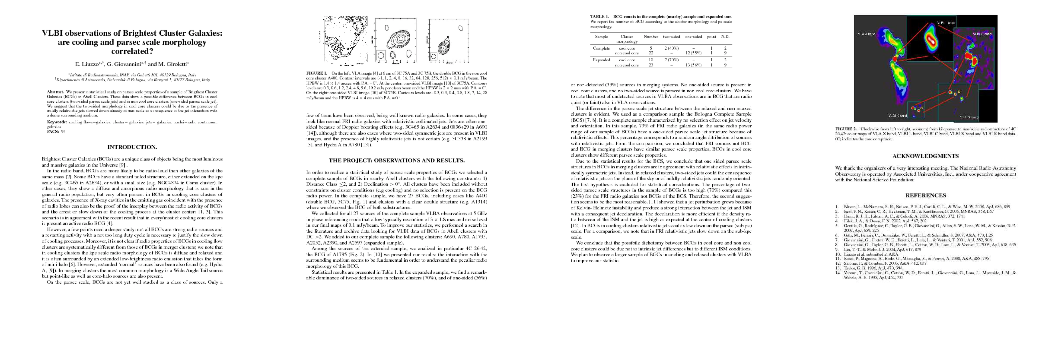 We present a statistical study on parsec scale properties of a sample of Brigthest Cluster Galaxies (BCGs) in Abell Clusters. These data show a possible difference between BCGs in cool core clusters (two-sided parsec scale jets) and in non cool core clusters (one-sided parsec scale jet). We suggest that the two-sided morphology in cool core clusters could be due to the presence of mildly relativistic jets slowed down already at mas scale as consequence of the jet interaction with a dense surrounding medium.